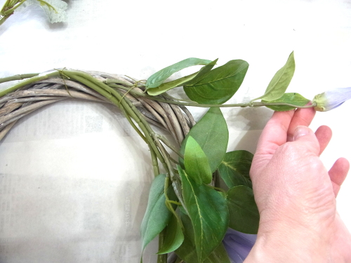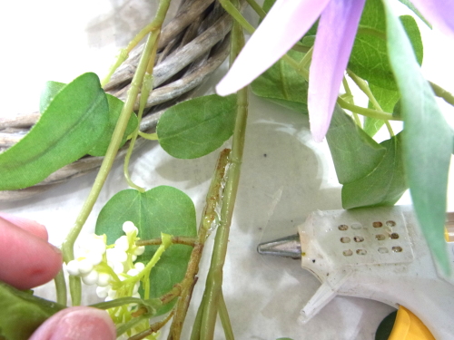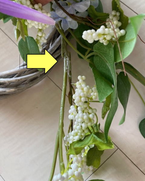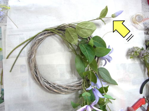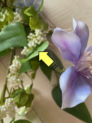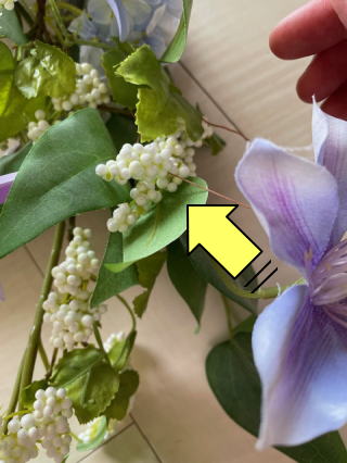 | 重めのものはワイヤーで固定してきましたが、ここから先はグルーで作れます。 白い実は好みの位置に リースの目地や、クレマチスにつけてグルーで固定します。 クレマチスのつるの先端の方に付けたい場合は、セロテープでまいてとめると簡単です(黄色の矢印) ソロテープは光ってしまうので、気になるようであれば、葉っぱシールをはりましょう。 |
