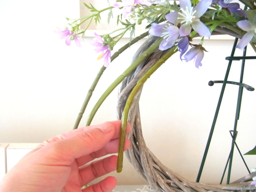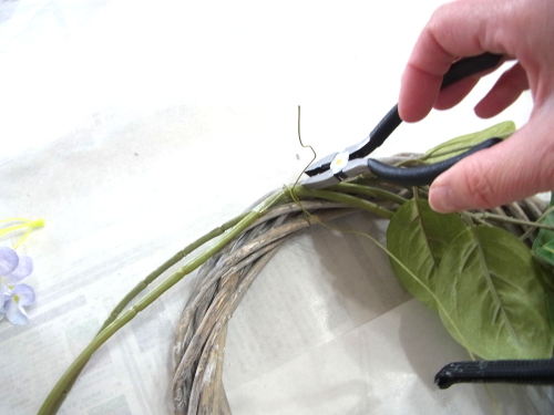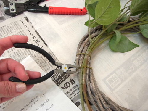ワイヤーは何重にもする必要はありません。1重か二重程度でOK。それよりも大事なのは、際です! ポイント 際をきゅっとしめます。このようなペンチがあると、しっかり固定できます。立ち上がるほどねじる必要はありません。5~6回ねじれば十分です。 余分はワイヤーはカットしします。切り口はできるだけリースの中に向けておきましょう。 |