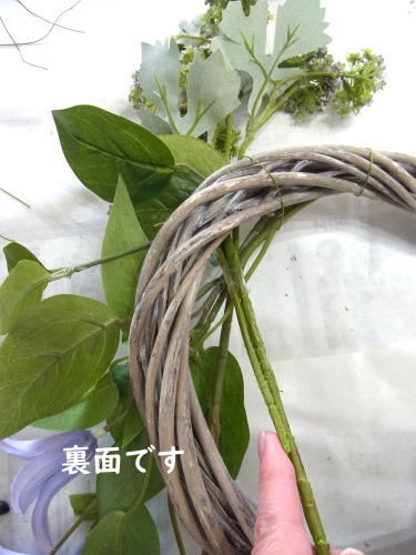| ポイント 仕上げに、後挿しで茎をいれます 最初にカットした茎を適当な長さにカット。1~2本をたわめてさらにリースに入れ込んで、つながっているかのように立体的に仕上げましょう。 コツは後ろより、前にでるようにすると、グッと重厚感がでてアレンジの格があがります。 フックをつけて完成です (ちょっと暗いですが、ご参考までに) |