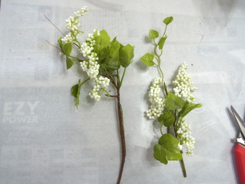 | 白い実を小分けにします。左側につかってもOKです。 ポイント 白はとても目立ちます。 クレマチスの下に入れ込むと色バランスがとれます。あるいは、目立つことを利用して、反対側のサイドにいれてもぴかっとして素敵です。 |