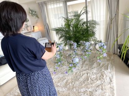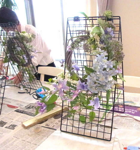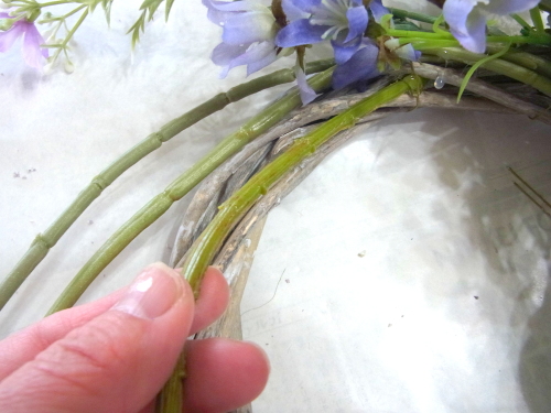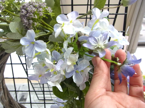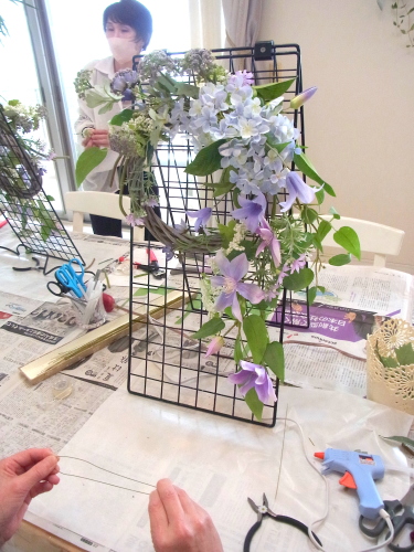 レイアウトの場所にもよりますが、短い方のクレマチスのつぼみは、一旦、茎の分かれ目からカットして 8割くらい、お花がはいったあとに、あるいは、仕上げにいれると、綺麗にバランスがとりやすいです。 |