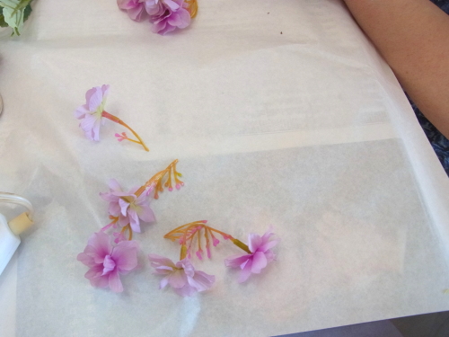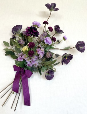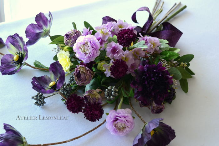 | 全体をみて、動かしたいお花があったら、調整します 紫陽花をカットして、移動したり、ラナンキュラスをカットして移動もOK いずれもグルーで固定できます。 |