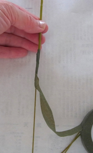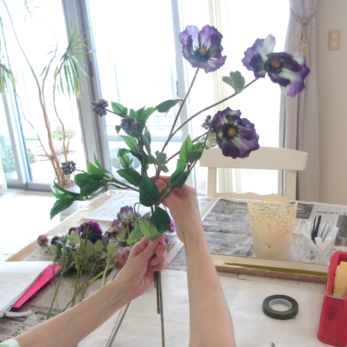 | 私はポピーをこんな風に右に2本いれみました。 みなさんは同じでなくても全く構いません、ご自身の好きなレイアウトで楽しんでくださいね! 持ち手にとめます。 こころもとないときはすぐ下に、もう一段下にテープを巻いておきましょう。 ここまではしっかり目に巻きます。 |