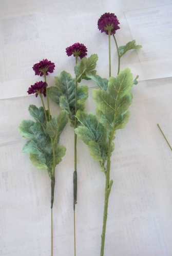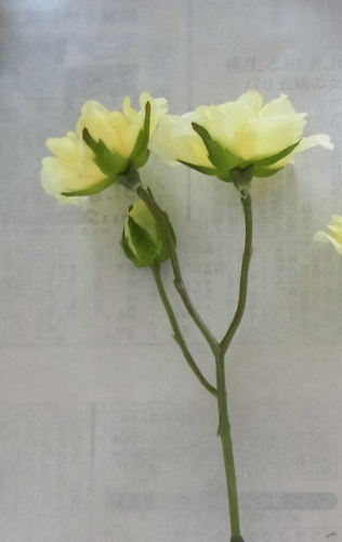 | 紫陽花がはいったら、黄色のバラをすきなところにトッピングします。 ポイント グルーは茎の切り口ではなk、茎全体に広く面でつけます。とめたい位置にある花材を足場として、そこに固定します。 入れたいところに足場となる花材がない場合は、添木をしてもOKです。 黄色はとても目立ちます、分けても良いです、このままでもOK いずれにしても、強烈なアクセントになるので、いろいろ試し置きして決めましょう。 |