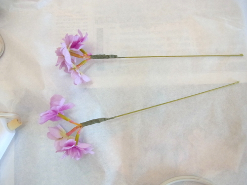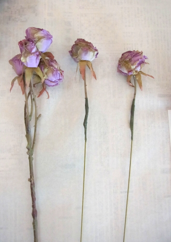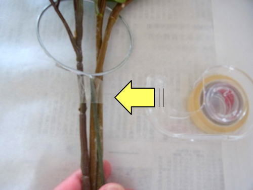 | バラも 小分けにして添木します。この段階では、2輪にしていますが、必要に応じてもっと分けてもOKです。 |