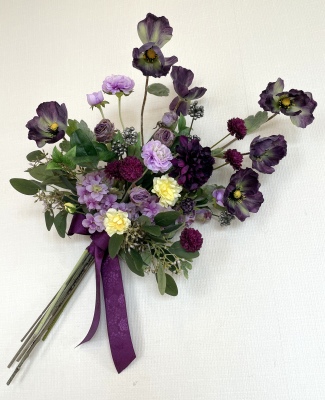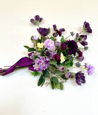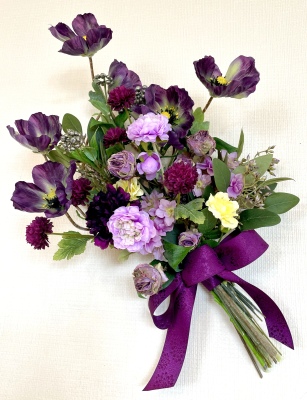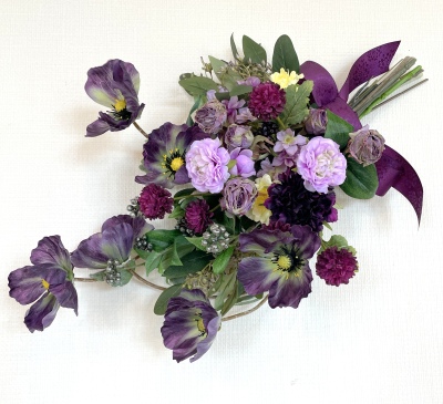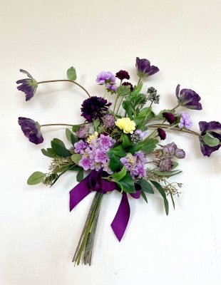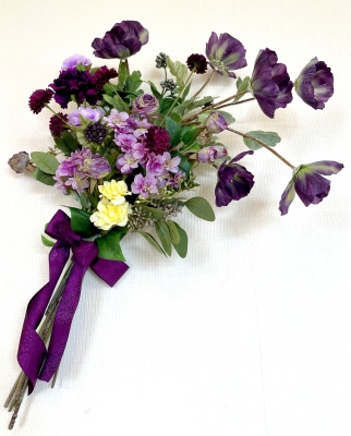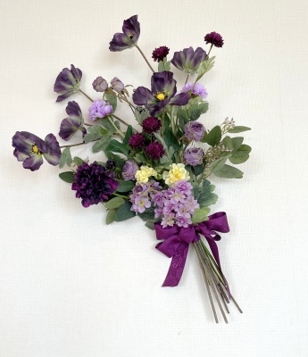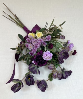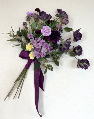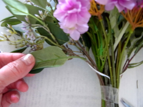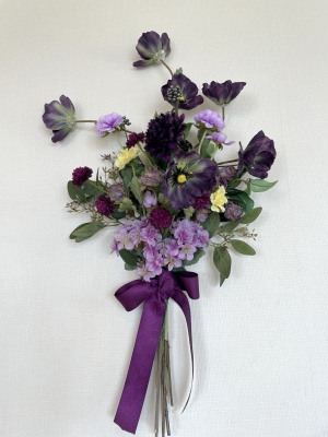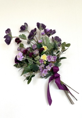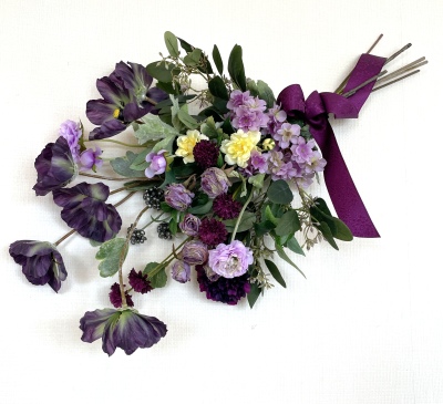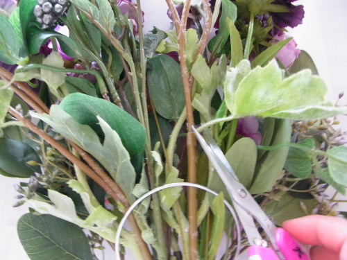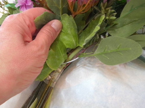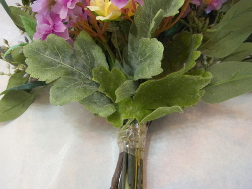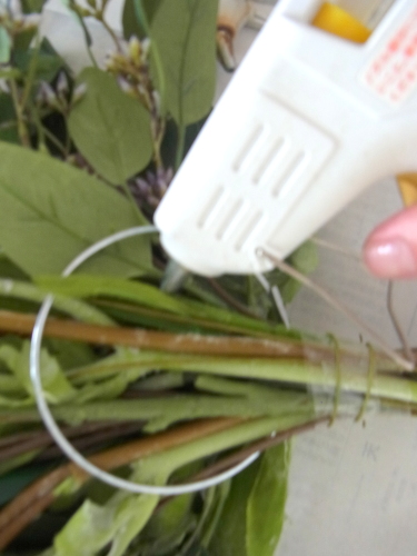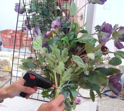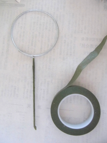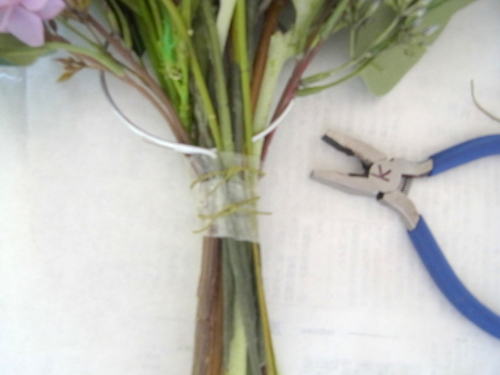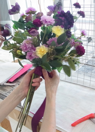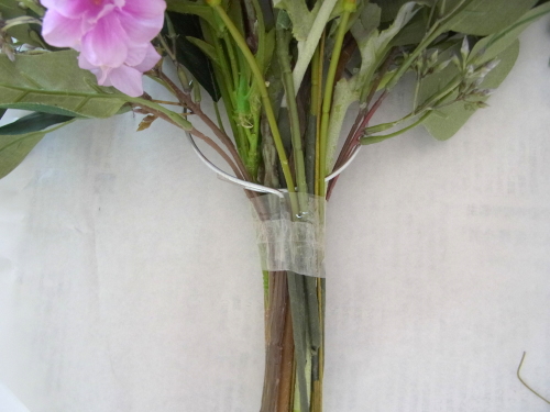| 全てのお花の場所がきまったら、仕上げは持ち手にワイヤーをまいてしっかり固定します | |