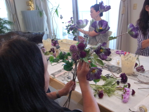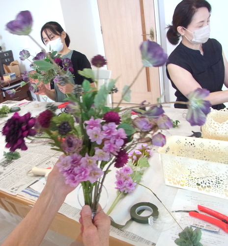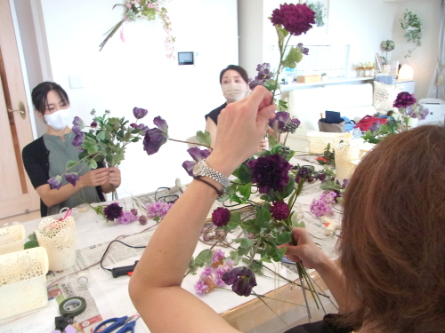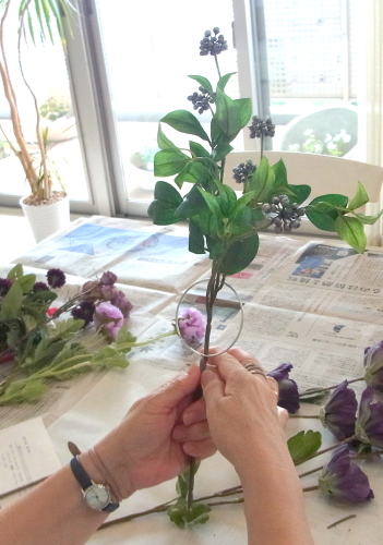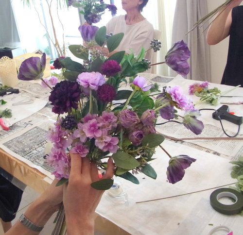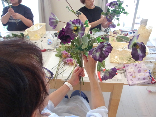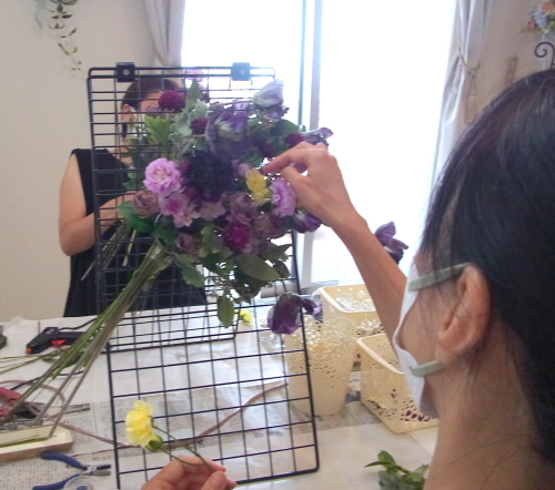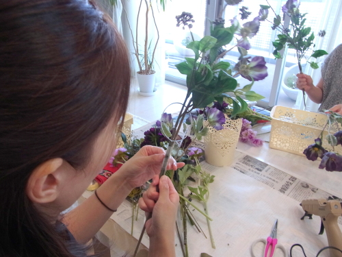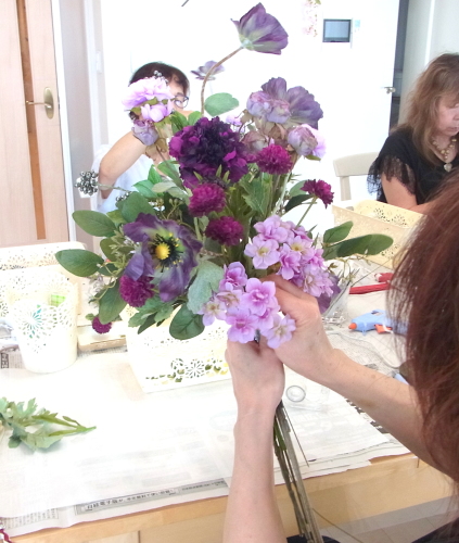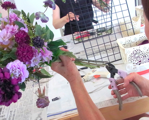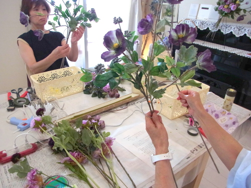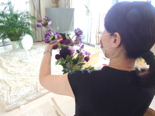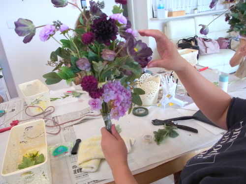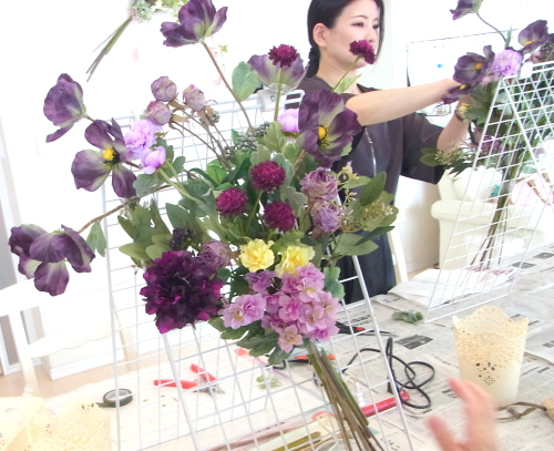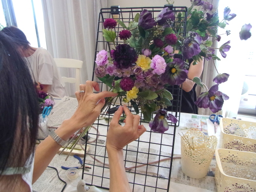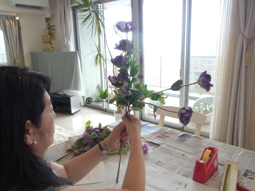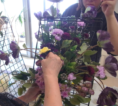 | お花と対話しながら、好みのレイアウトにしてましょう、 ポイント 高層の花と、低層の花を分けて作ると、ふわっとしたお花になります。 |
