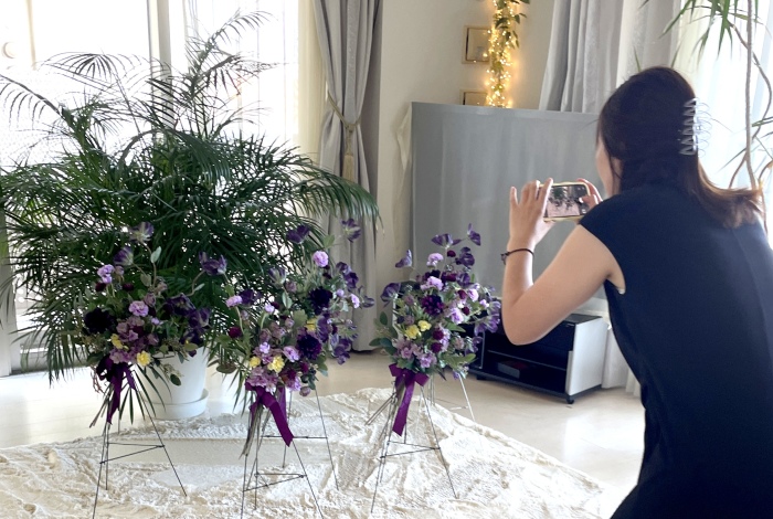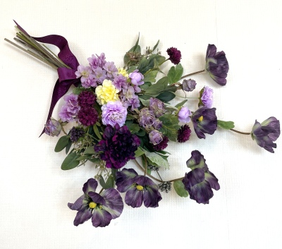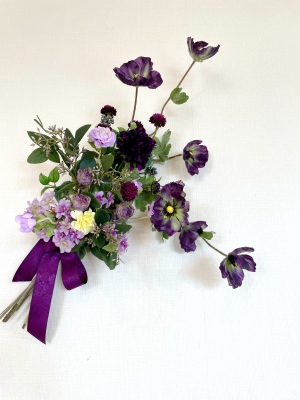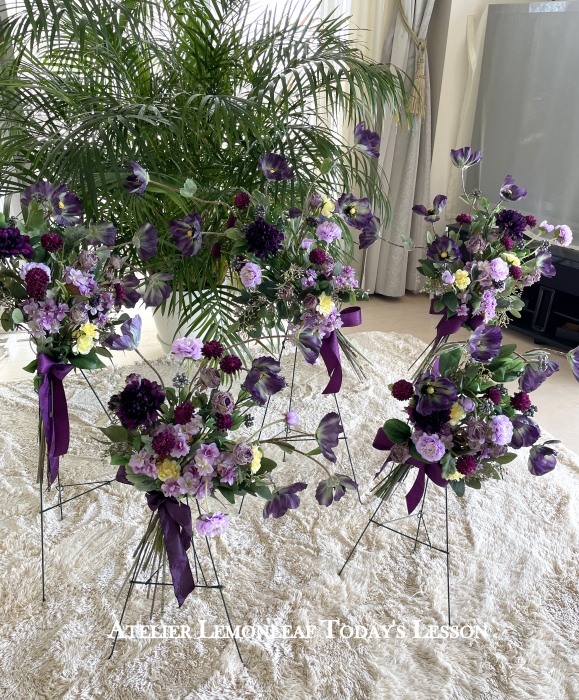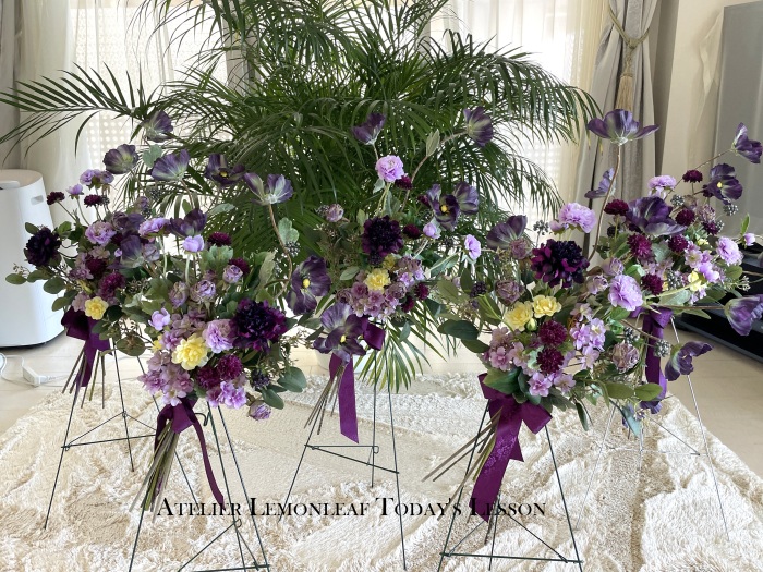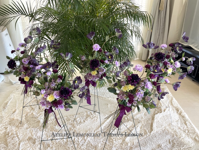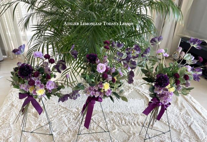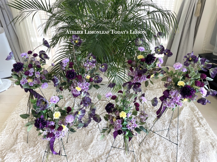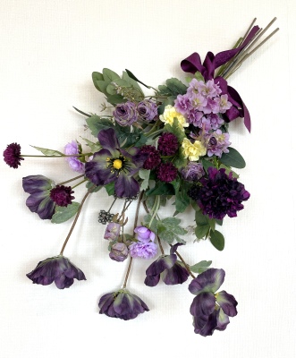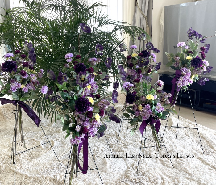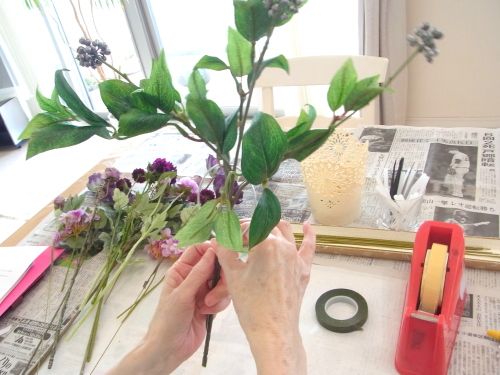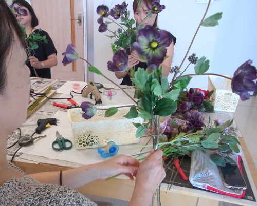 | お花と対話しながら、好みのレイアウトにしてましょう、 ポイント 高層の花と、低層の花を分けて作ると、ふわっとしたお花になります。 |