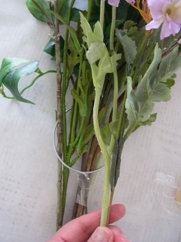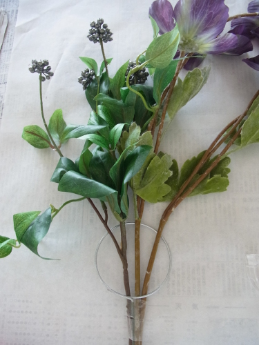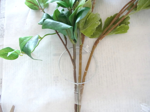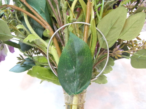 | リングがみえていたら、 不要なはっぱや、先ほど取り除いた葉っぱを生かして隠します。 ポイント リングを隠すためにリングに貼らないでください、輪がフックとしてつかえなくなります。 隠すためにはリングの前にある周辺の花材にはりつけましょう |