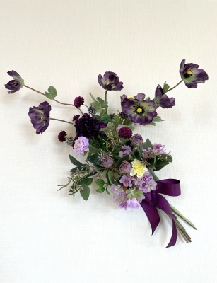 | シルバーベリー、ポピーがしっかりとまったら、ここから先は自由に、ユーカリと紫陽花を除いて、他の花材を自由にアレンジしていきます。 ポイント このとき花材の下の方にある葉は取り除いておきましょう、リングに入れるときに、穴をふさいでしまいますし、お花の位置を上下するにひっかります。 ここからのセロテープはゆるっとで構いてください。なぜなら、お花を上下させるためです。 一輪づつまいてもOK,2輪まとめてもOKです リングの空いている隙間に花材を挿しては、持ち手にとめるを、繰り返します。 ポイント できるだけ 直立させるのではなく、グッと自分にむけて突き出ようにカーブさせたり、あえて横顔にしてみたり。 全体がナチュラルで表情豊かなアレンジになります。 |