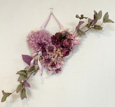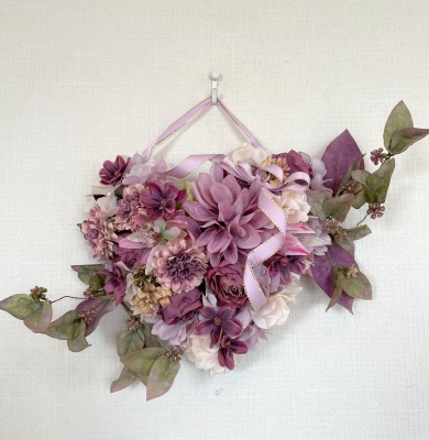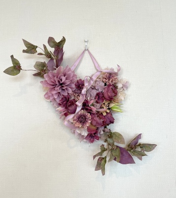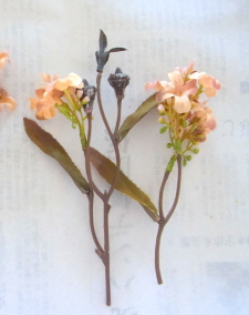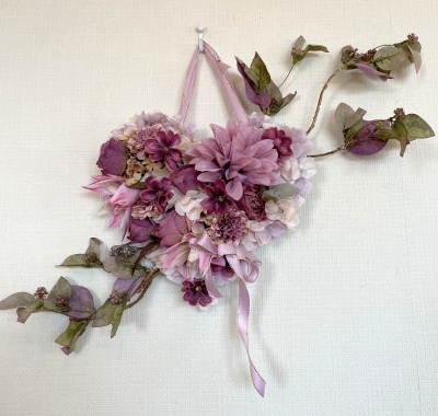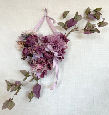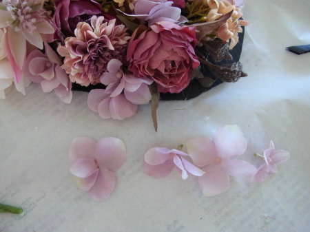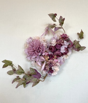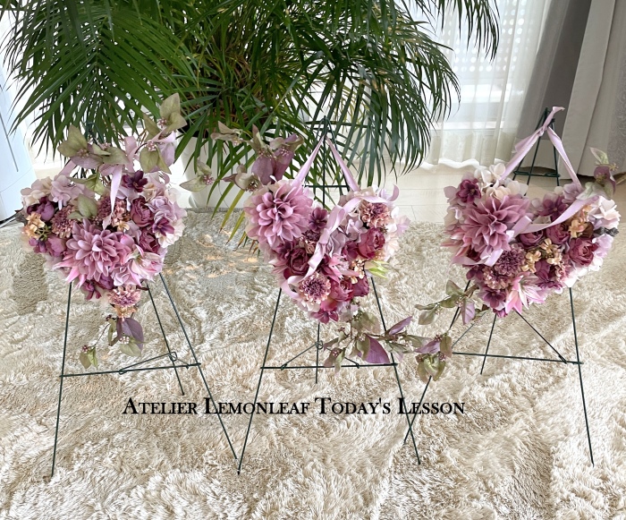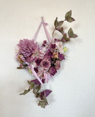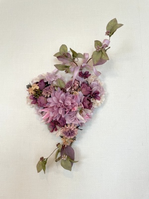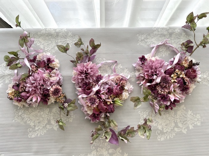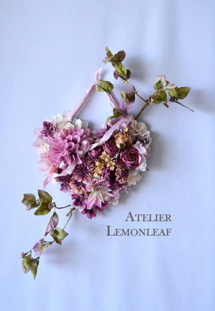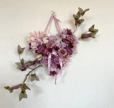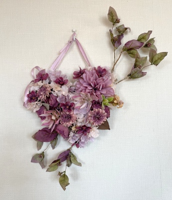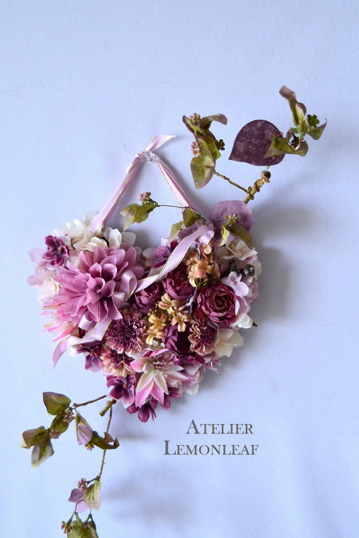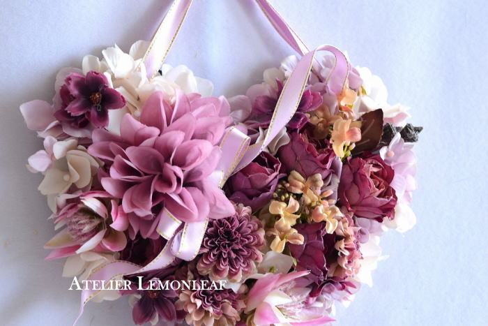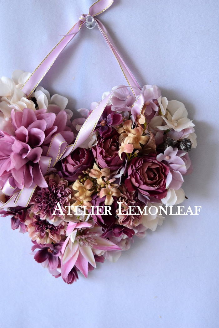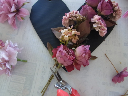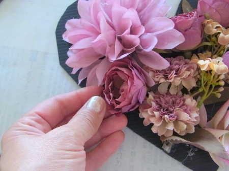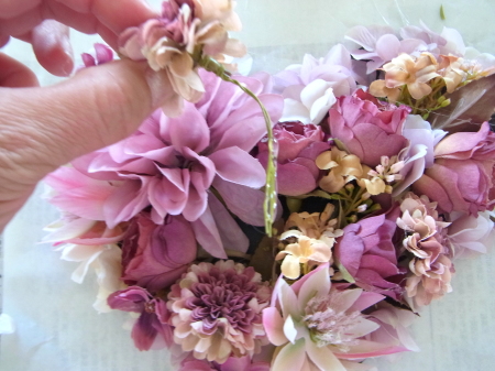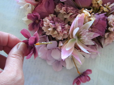| ポイント ハートに見えるには、中央のV字がしっかりみえていることが大事です。ここが隠れてしまうと三角形になってしまうので、注意しましょう お花が全部ついたら、紫陽花を小分けにします。かなり小さくします。 |