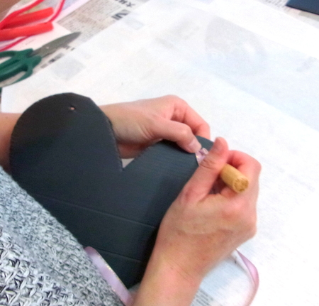 | キリや目打ちなどで、穴をあけて先に、吊るすリボンをつけておきましょう。、 | |