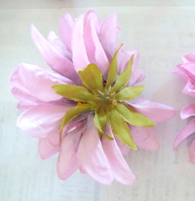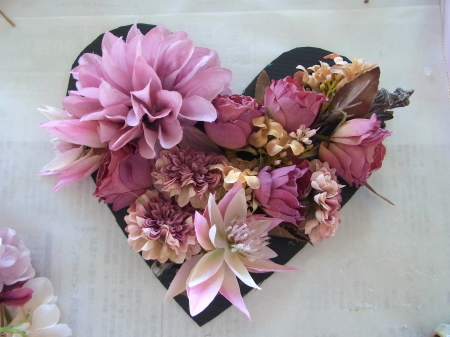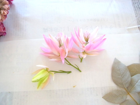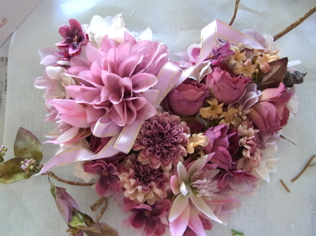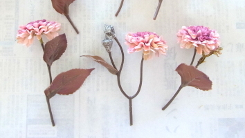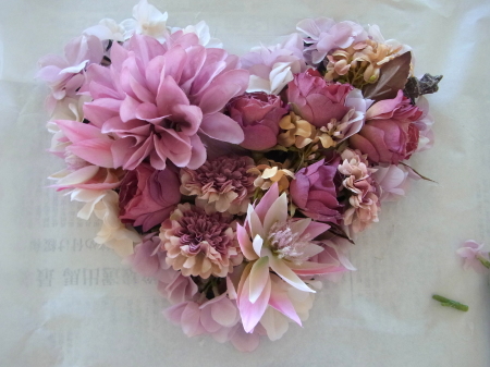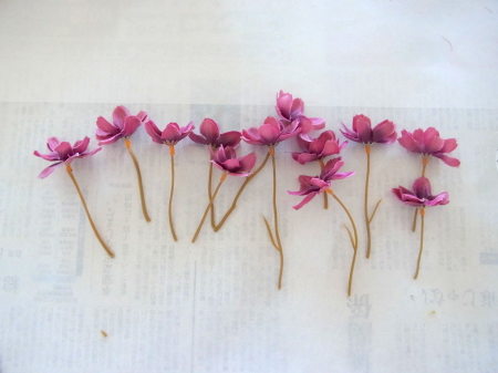 | 仕上げに コスモスをトッピング。全部はつかわなくて大丈夫です。あまったらあとで、枝に付けるのも手です これでお花は完成なので、先がとがっているか?ハートのV字はみえているかチェックしておきましょう |