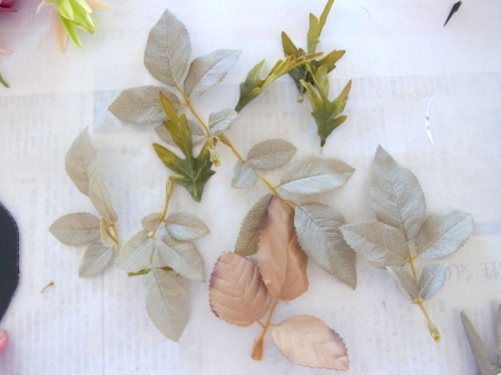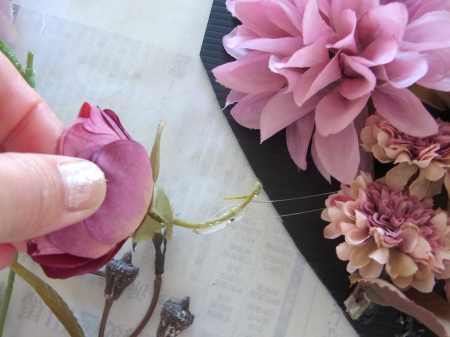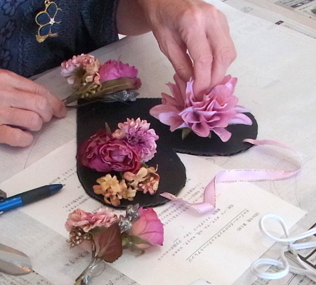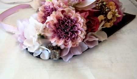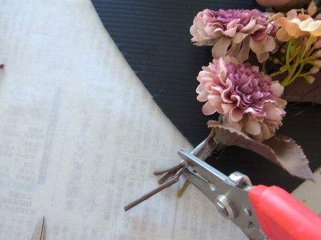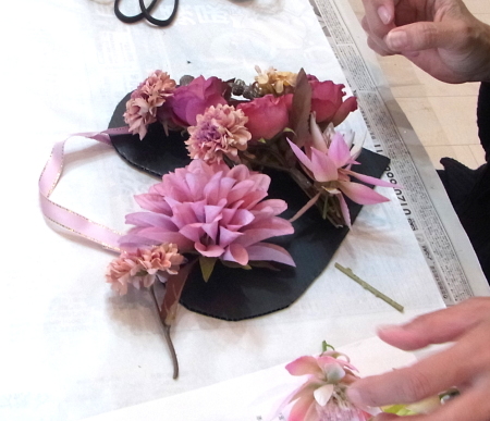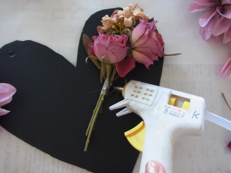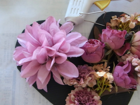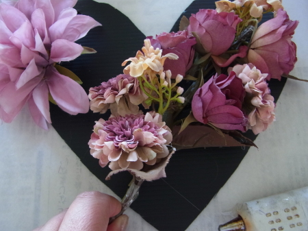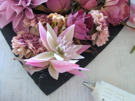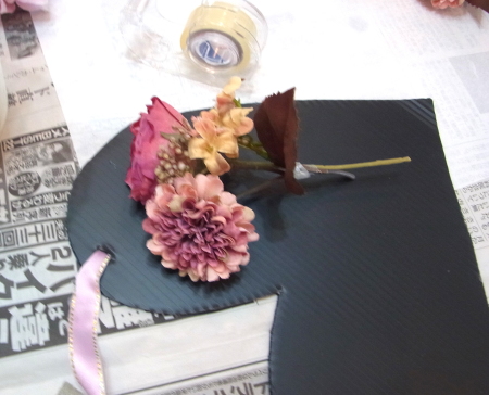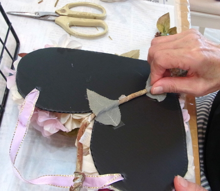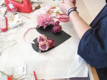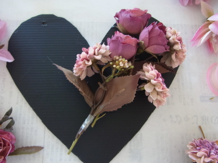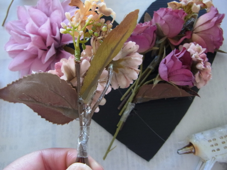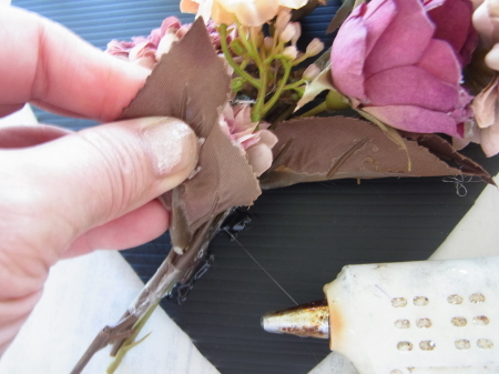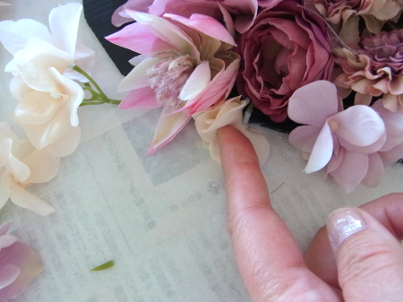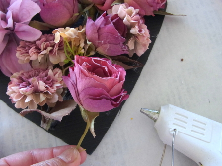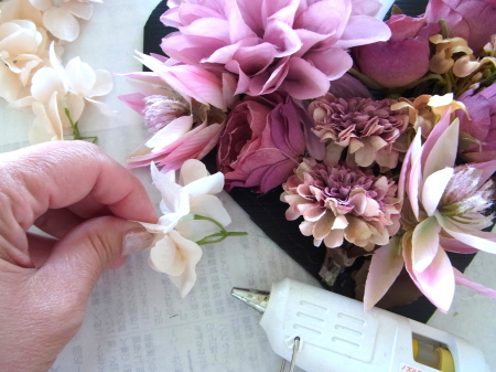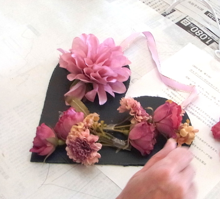 | レイアウトがきまったら ひとつひとつ、グルーで固定します。 ポイント 葉っぱもふくめ 花束と板の接地面の全部にグルーをつけます。 |