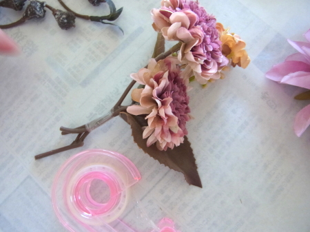 | バラ、マム、オレンジの小花から 2~3j本あつめてミニ花束を3つ 作ります。 セロテープで持ち手をまとめればOK。 丁度まとめたいところに、葉っぱがあって邪魔な場合は、カットして巻いてください。 組み合わせは自由です。お花があまってもOKです ポイント 同じ高さではなく、後ろの花を少し高くして段差をつけてください。 持ち手から下の部分が長いときは、カットしておきましょう。 |