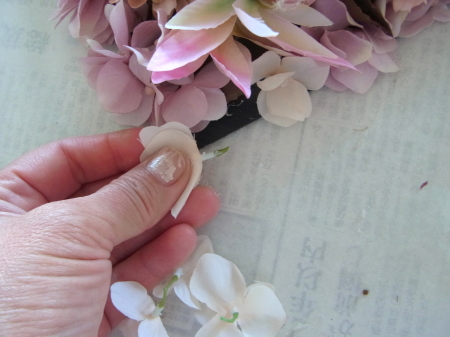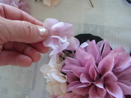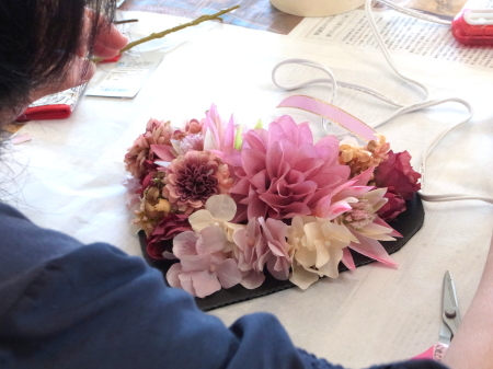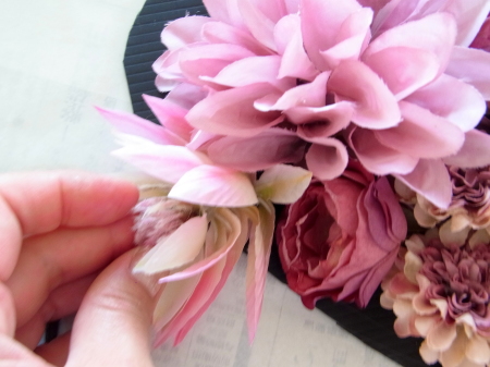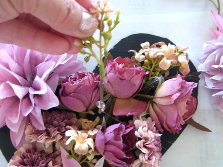 | 大きな穴がうまったら、黒く見えている縁取りを 一枚一枚にした、紫陽花で隠します。 黒い部分は全部見えないようにしましょう |