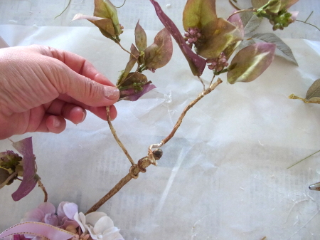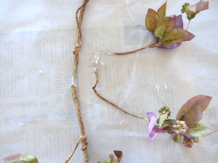 | 枝の中央にあるツルをはがします。 ポイント 全ての花材は素材です。ただのアイテム。 売っている通りに思い込まないこと、このままつかってはダメ。上も下も、裏表も、決めるのは貴方です! こうしてはがすとパーツになって何通りもたのしめますよ! |