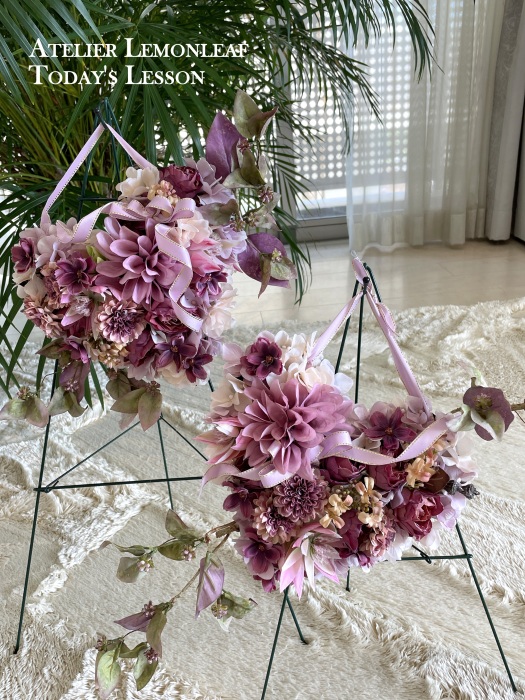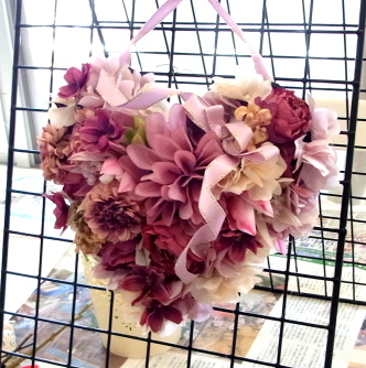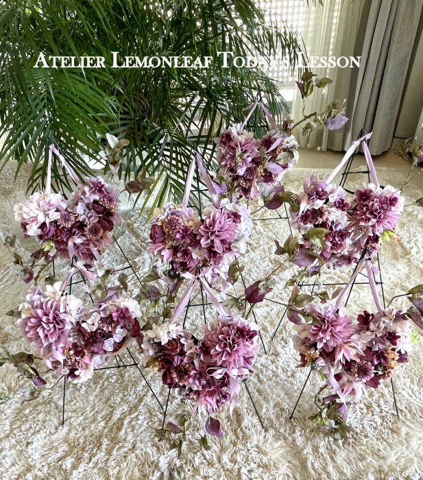 | ダリア、セルリア、小束3つで全体のれうアウトをきめます。 花束はトップから下がりながら重ねると綺麗に見えます。 |