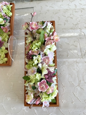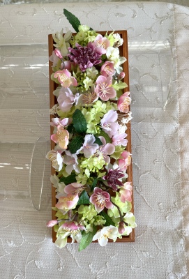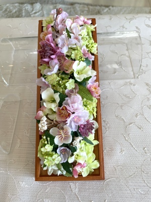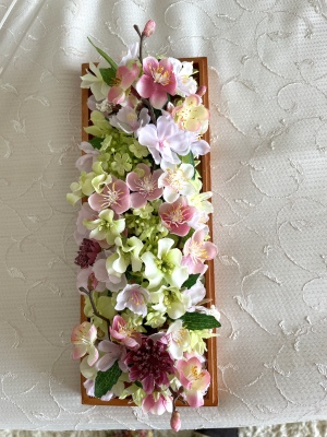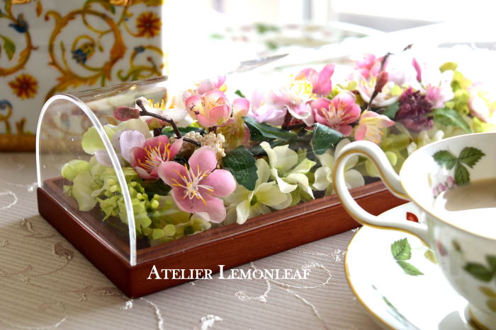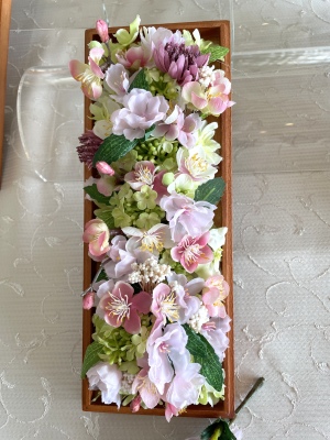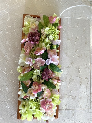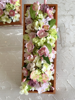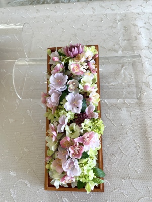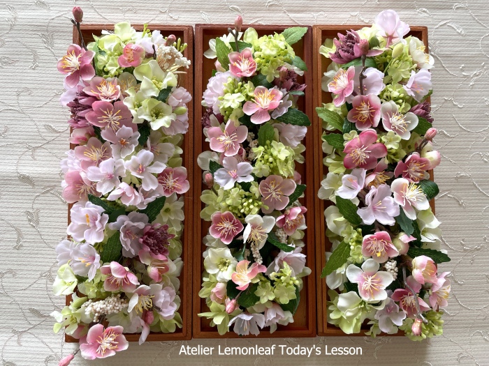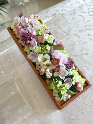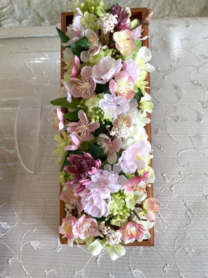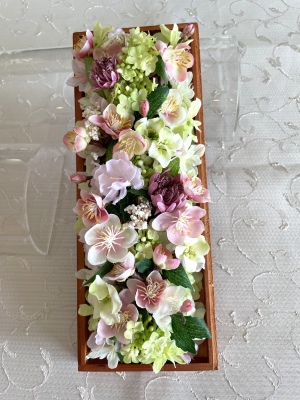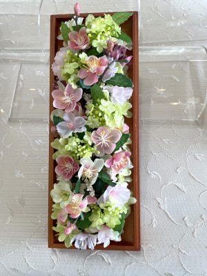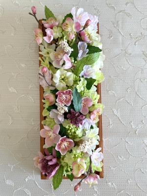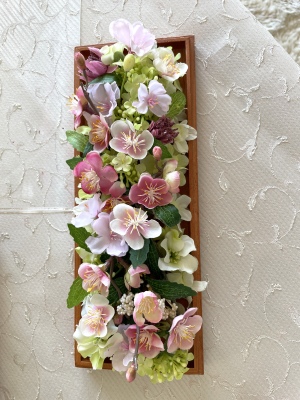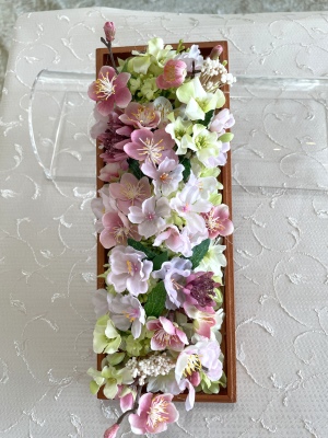 | メインの梅が入ったら桜を好みの場所に。 散らしてもよいですし、まとめてグルーピングも可愛らしいです。 アクセントの小花たちを適宜カットしてトッピングします 濃いめの赤いアストランティアは 引き締めカラーになります。 飾り方 ふたを閉めて飾ってもよいし、あけたままでもOKです。あるいは立たせて縦にかざることもできます。 そのときは蓋がはずれないように、添付の輪ゴムで上下とめておかれると安心です。 |