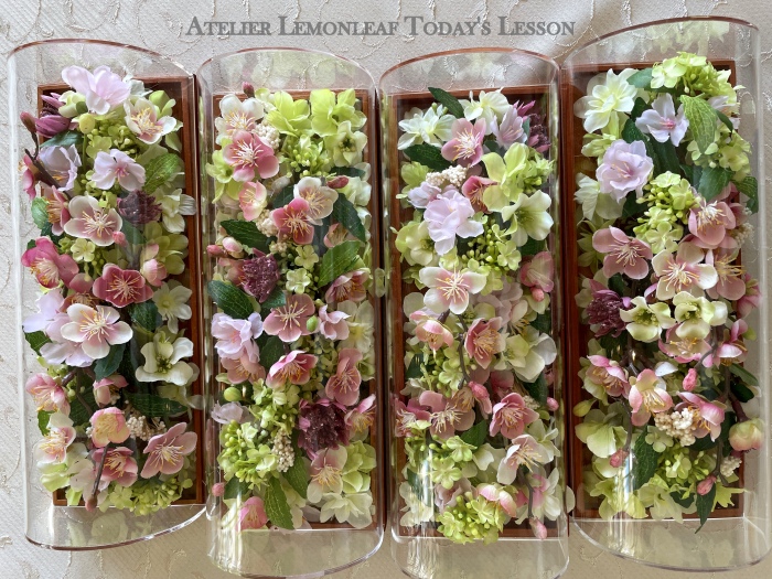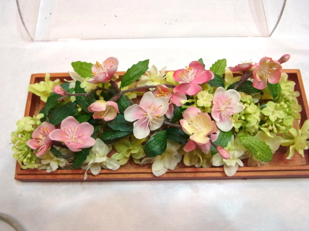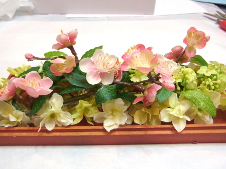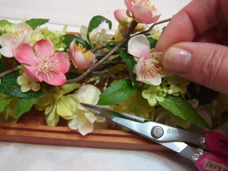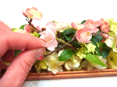 | ここからメインの梅と桜をトッピングして行きます ポイント 選べるスペースがいっぱいあるうちに メインを魅せたい場所に入れましょう グルーをつけて、梅がコデマリの間からでているように、やや斜めに入れるのが綺麗に見えるコツです。 ポイント グルー切り口につけるのではなく、幅広く面でつけましょう。器の底板以外にも、アジサイやコデマリにつけてくださってOKです |