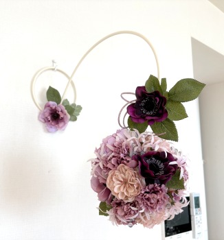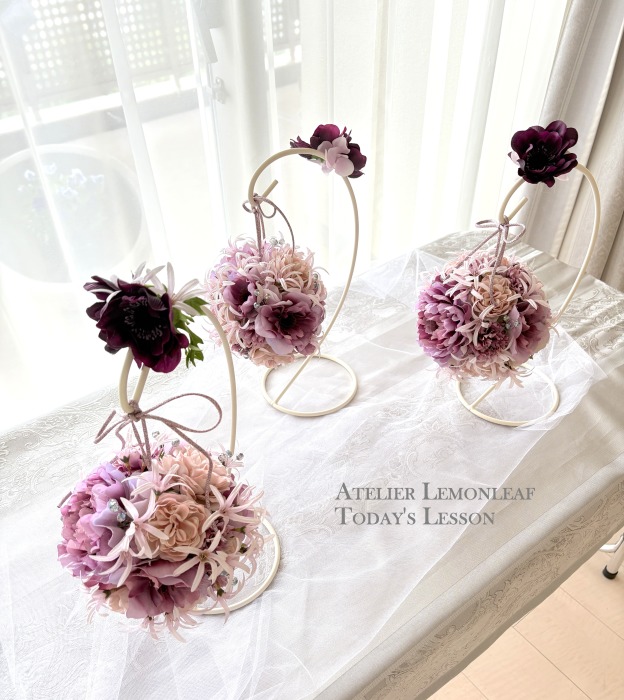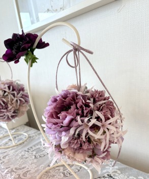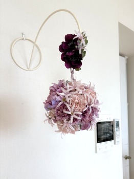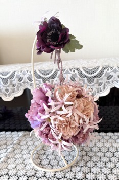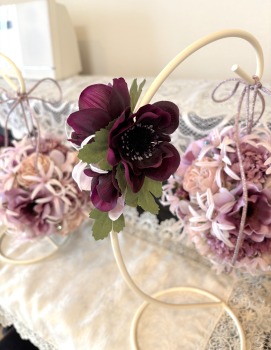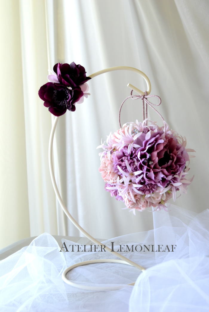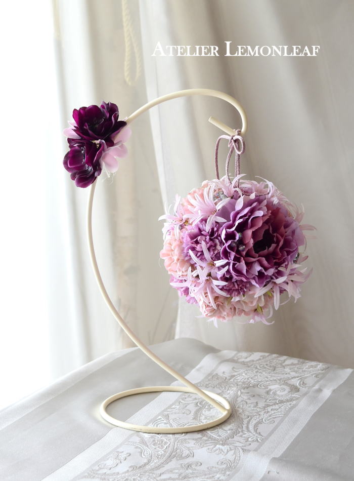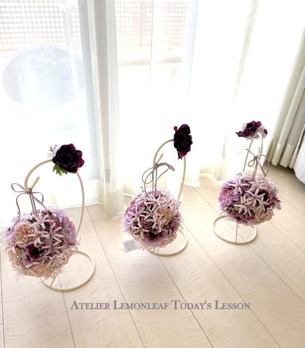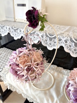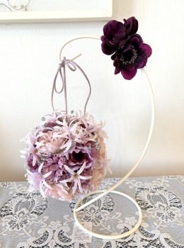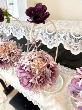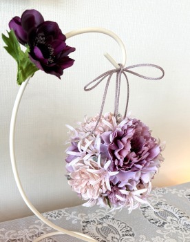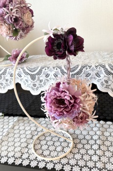 | アネモネはアクセントに、スタンドの好きな場所にグルーで固定。バック処理はとっておいたアジサイ2輪程、l度を貼り付けています。 アジサイでなくても バラや、カーネーションのグレイッシュな葉っぱを添えても素敵です。 このアネモネをボールブーケにいれて、他のお花と差し替えてもOKです。また別の印象のデザインになりますよ。 これで完成です!! インスタ作っているシーン |