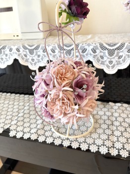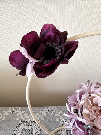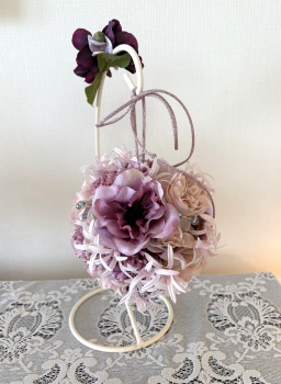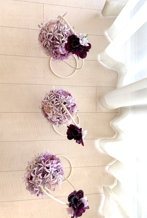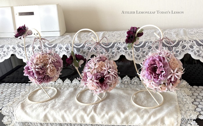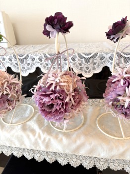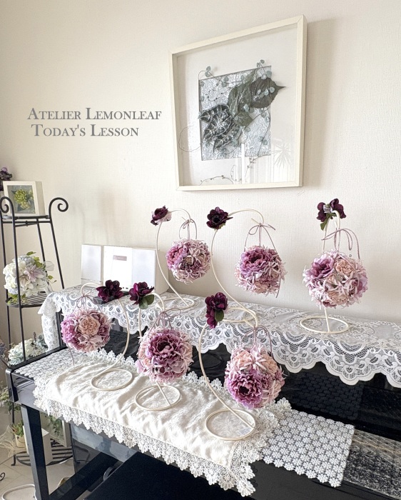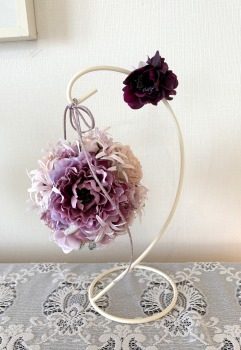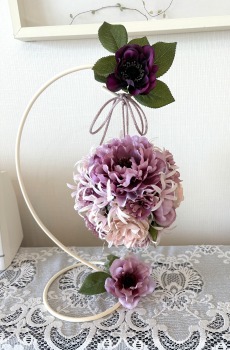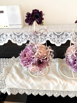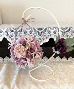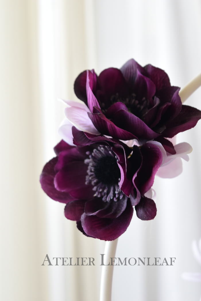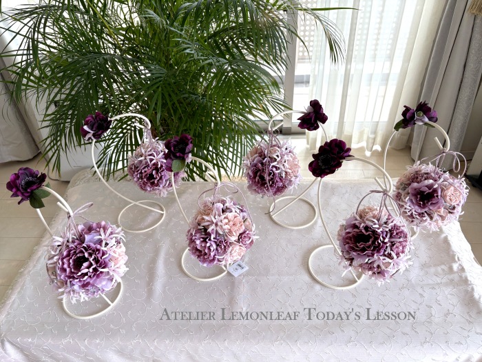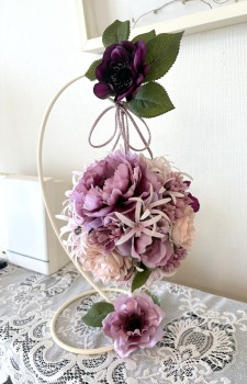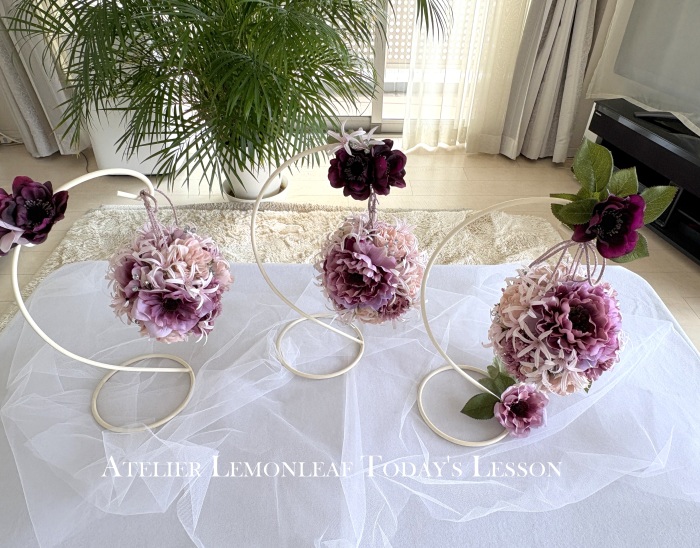 | アネモネはアクセントに、スタンドの好きな場所にグルーで固定。バック処理はとっておいたアジサイ2輪程、l度を貼り付けています。 アジサイでなくても バラや、カーネーションのグレイッシュな葉っぱを添えても素敵です。 このアネモネをボールブーケにいれて、他のお花と差し替えてもOKです。また別の印象のデザインになりますよ。 これで完成です!! インスタ作っているシーン |