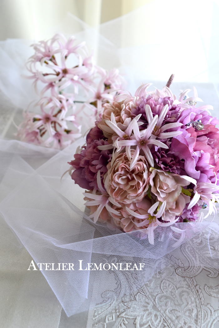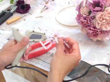 | グルーガンでふわっとのせていきます。奥にいれず、お花たちの表面に乗せるイメージで。 ポイント 奥にいれると、ネリネの花びらのカーブの良さが見えなくなってしまいます。見た目が固いボールの印象になるので、あくまでも、ふんわりと。。 |