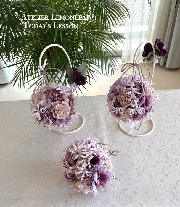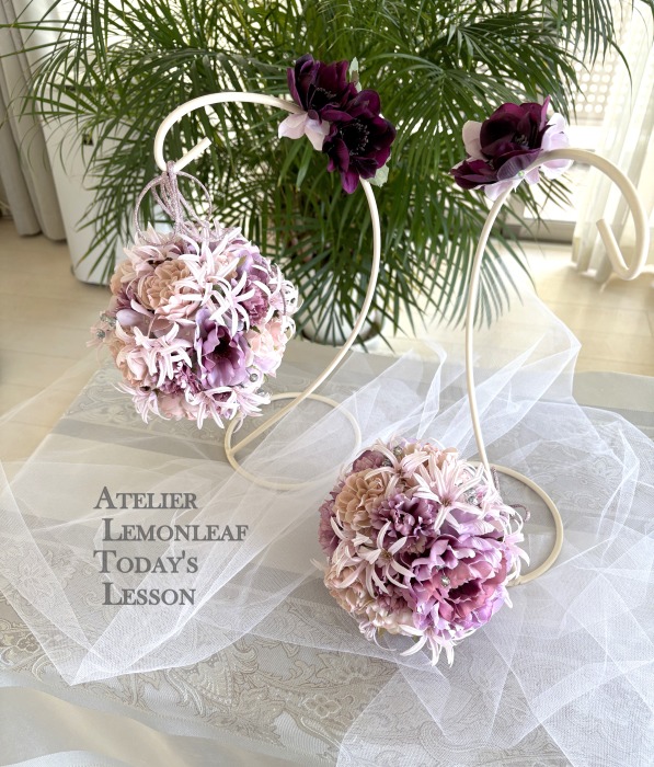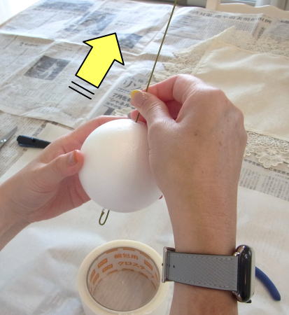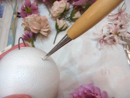 | ★ご用意いただくもの 目打ちか、キリ。木工用ボンド 太めのワイヤー(18番)を1本ご用意ください。 ****************** こんにちは 今月は久しぶりにボールブーケです!初めての方もいらっしゃるかもしれませんね。 球体を描くのでちょっと普段のレッスンとはポイントが反対なんです。 ポイント 凹凸つけない、花びらを重ねないです。一輪、一輪をしっかり開かせてあげることで、綺麗な面がつくれます。 ひとつひとつのお花の花びらが触れないくらいな。距離感をとり、しっかり開かせてあげましょう 今回は8センチの素ボールをつかっていますが、ここにいざ、デザインするとなると、相当な量のお花たちが必要なのです。 ボールブーケをつくるときは、見た目以上の大量のお花が必要であること、心しておきましょう。 ****************** それでは早速作っていきましょう! ガムテープなどの土台に乗せて転がらないようにしましょう。 真上から貫通させます。だいたい真中にでてくればOKです。 もしも、横にでてきてしまったら、やりなおしましょう。 やりなおして、ワイヤーが曲がってしまったら、新しいものと取り換えてやりなおしましょう。 一度曲がってしまったら、まっすぐささりません。 |