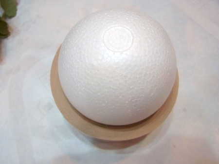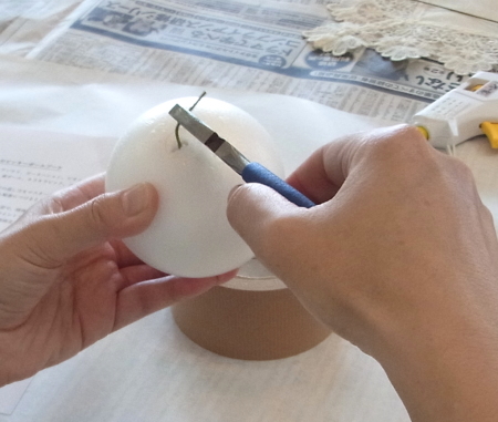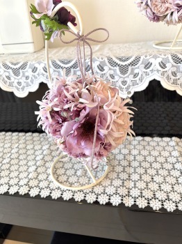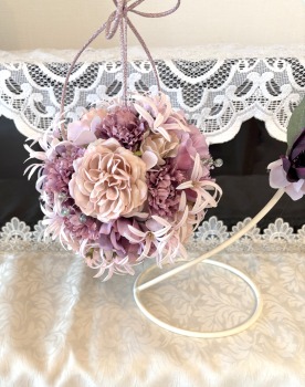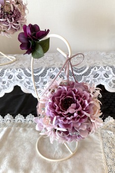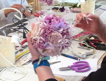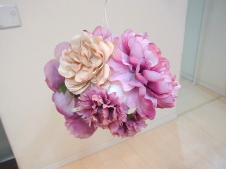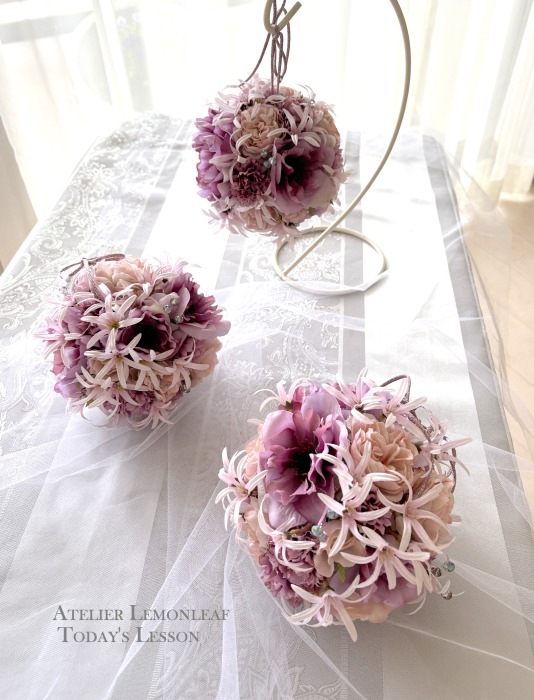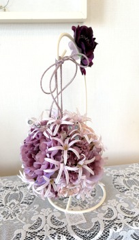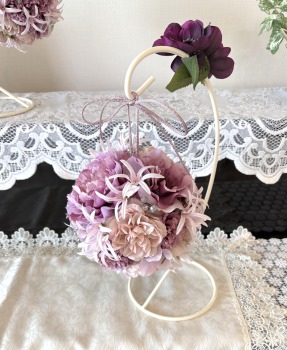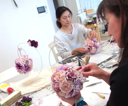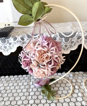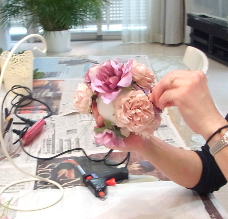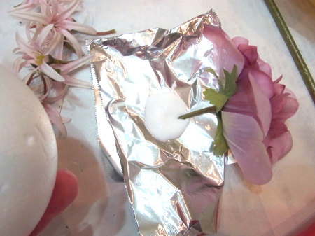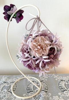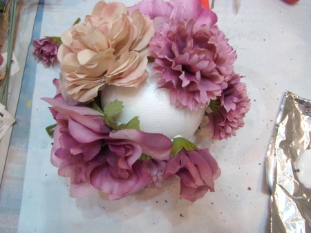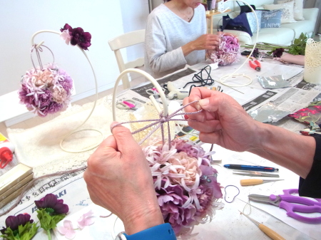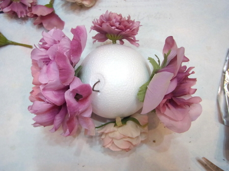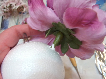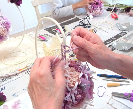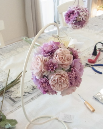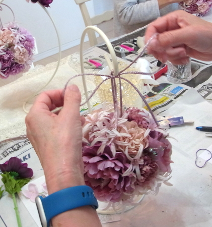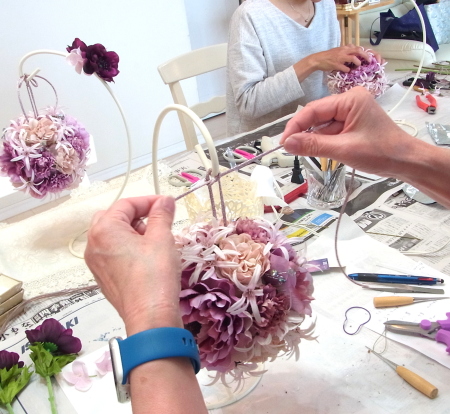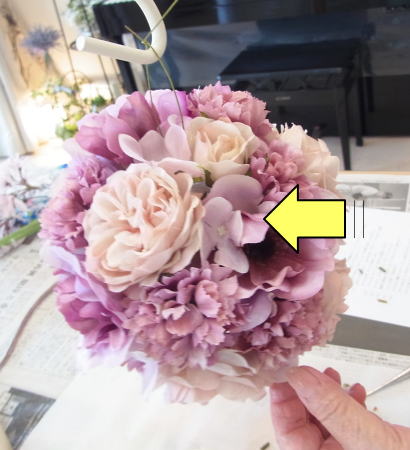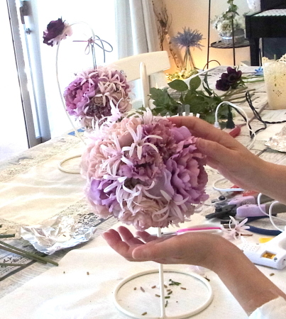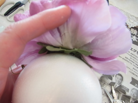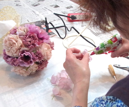 | 隙間にアジサイをいれていきます。これはグルーでとめます。 ポイント アジサイは、奥にいれこまずに、お花の間でふわっと止まる位置にいれます。 素ボールに貼り付ける必要はありません。 |