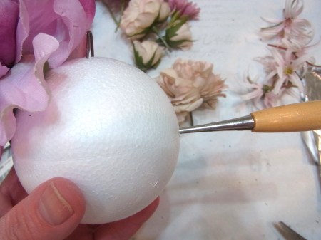 | メインの 大輪のピオニーを入れる好きな場所を決めましょう。どこでもOKです。 入れたい場所に目打ちで穴をあけます。目打ちは奥までしっかりいれましょう。 ピオニーは輪形が大きいので、ボンドをつけて、奥までぐっといれます。 注意 目打ちは抜いてしまうと、穴が締まって、どこだかわからなくなることが多いです。 お花がたくさんになってきたら、入れたいお花を常に手元に用意、挿した穴を見失わないうちに、入れましょう。 |