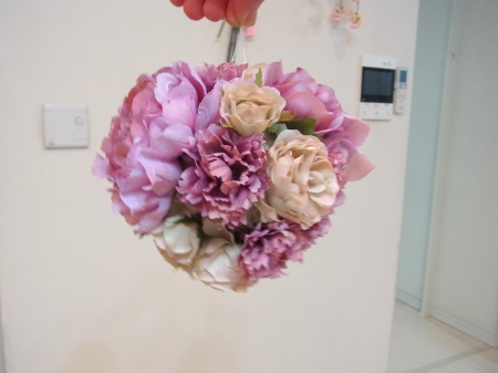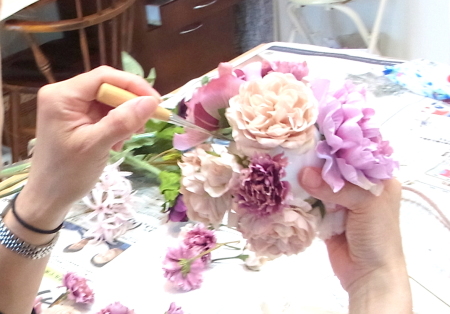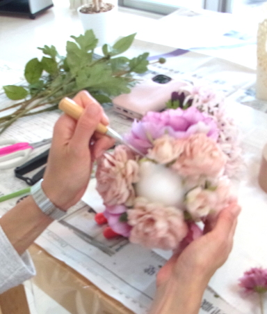 | ここからは、目打ちで穴をあけながら、大物のピオニー、ベージュのバラ、カーネーションの順に、お花同志が花びらを押し合わないようにいれます。 ボンドは乾くまで20分くらいかかるので、場所をかえたかったら、いくらでも挿しなおしができるから、大丈夫! あまり慎重になりすぎず、楽しんでつくってみてくださいね! |