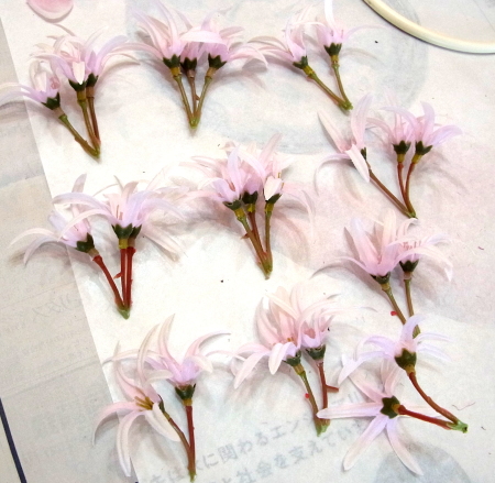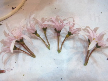 | ネリネを小分けにします。できるだけ、写真のように、2~3輪がついた状態でカット出来ると使いやすいです。 |