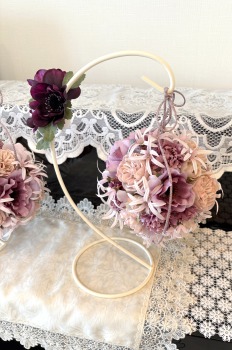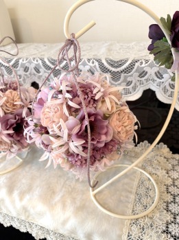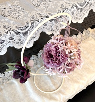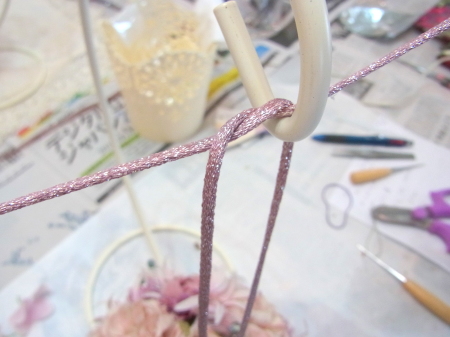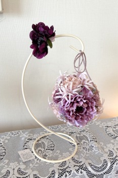 | 目印につけた最初の針金と、リボンを入れ替えて、吊るします。いろいろなリボンの結び方があるので、自由に結んでみましょう 写真は参考です。 スタンドのフックの上で一度結び、下げる長さをきめてから、正面にもってきて、さらに一度結び、そこからリボン結びにしています。 |