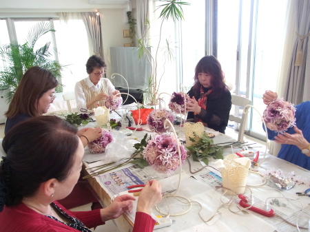 | ピオニーと、バラの大物がはいったら、次にカーネーションをいれます。 | |