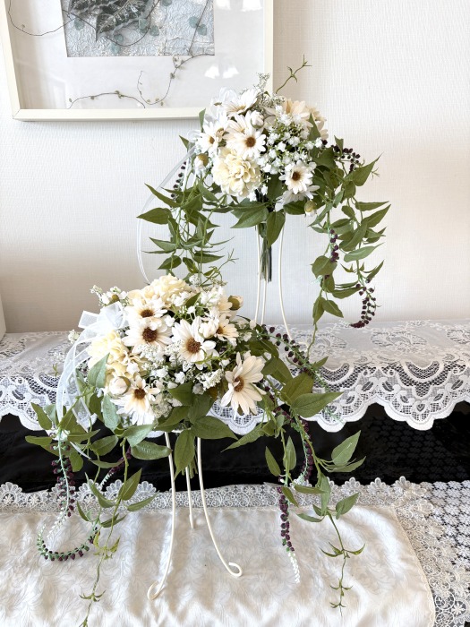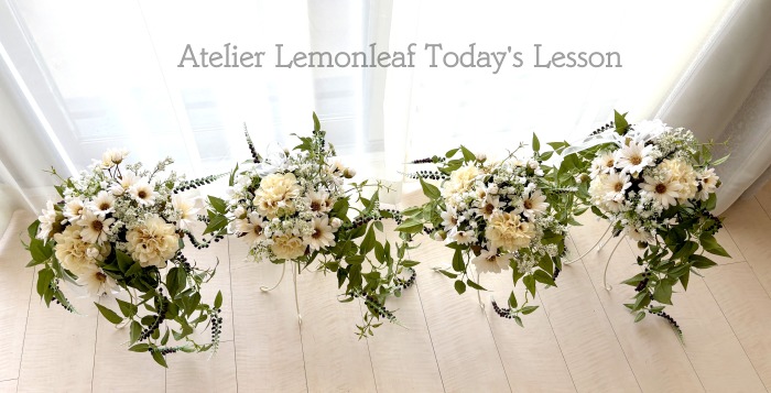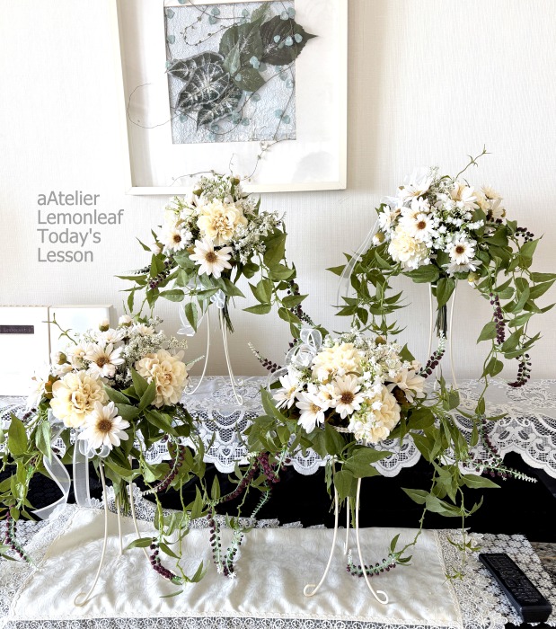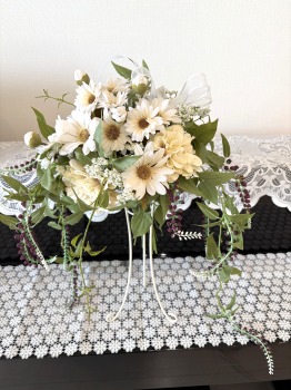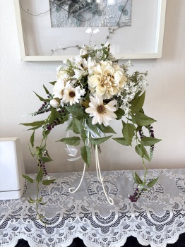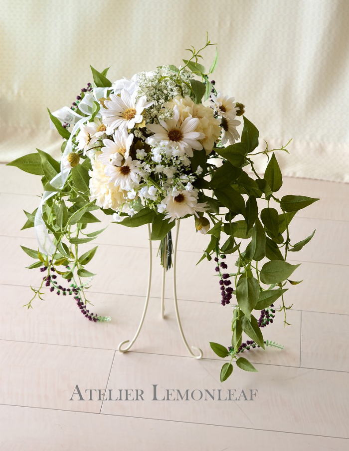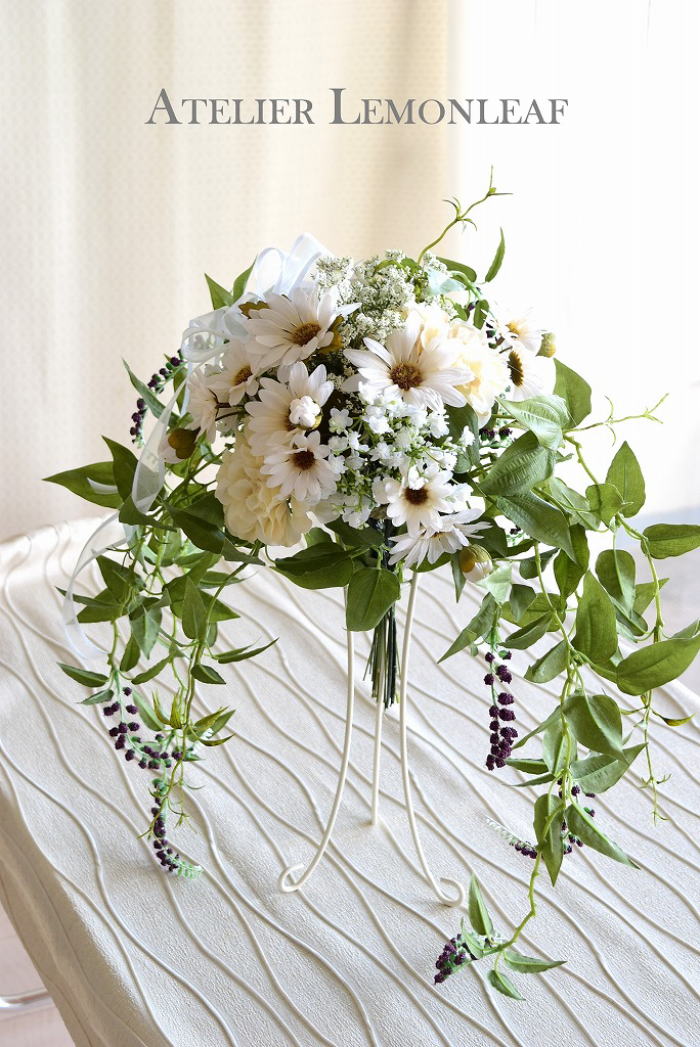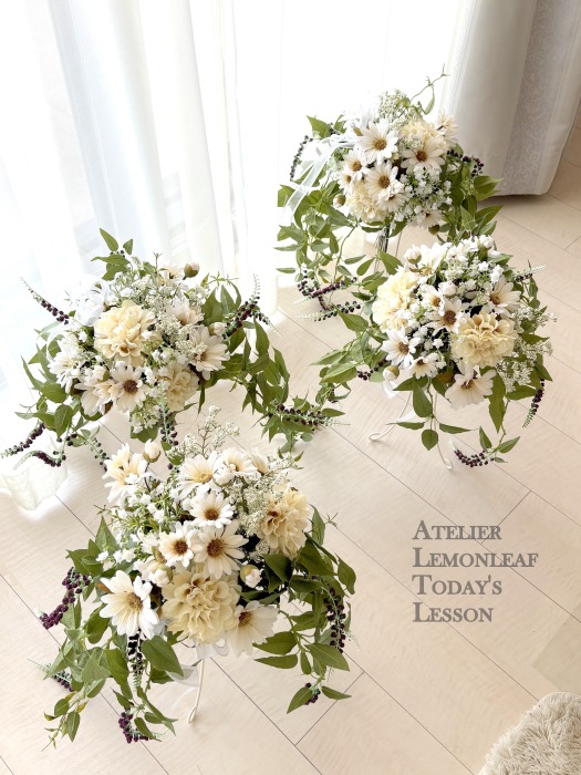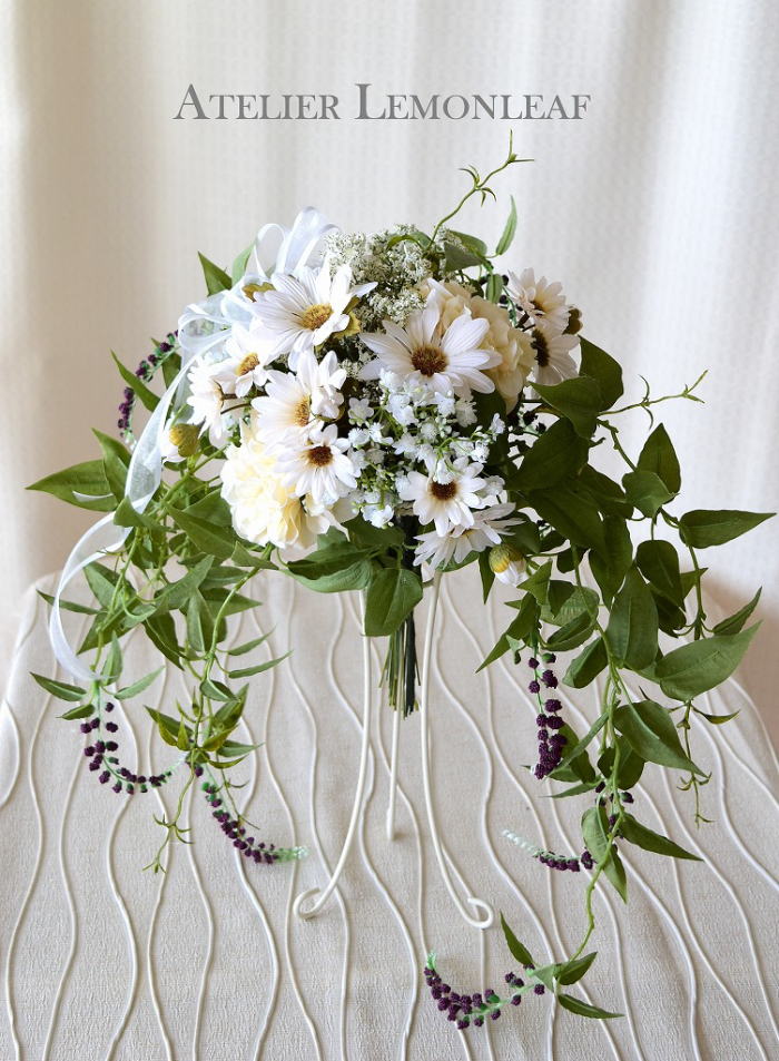 | 素敵なグリーンに出会いました。両サイドに添えるだけで、シャワーブーケのシルエットになります。 高さのあるスタンドが一層グリーンのツルの魅力を引き立ててくれます。実は足元に置いて上から見るのも素敵なんです♪ ではさっそく作っていきましょう ! デイジーはすべて小分けにします。 ダリアとデイジーに18番ワイヤー1/2を添え木してステムをつけます。 ポイント テープで巻くのは、重なっている部分だけでOKです。 レジを全部外して一本一本に 添え木します |