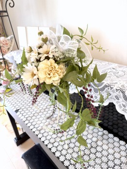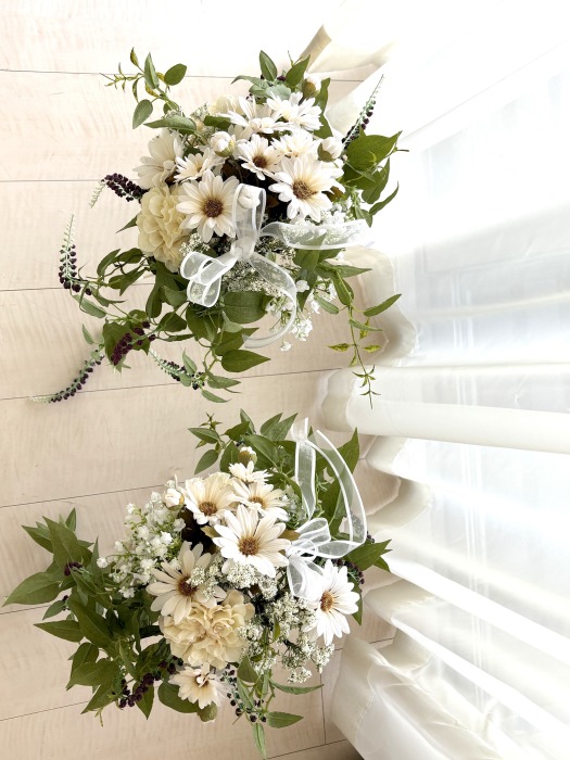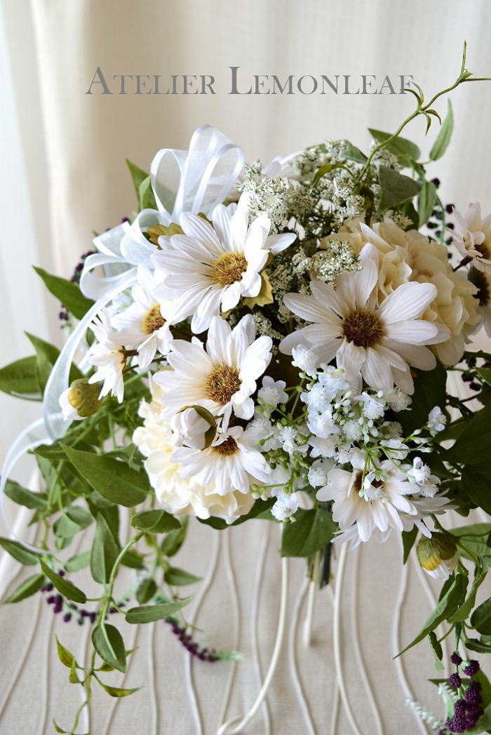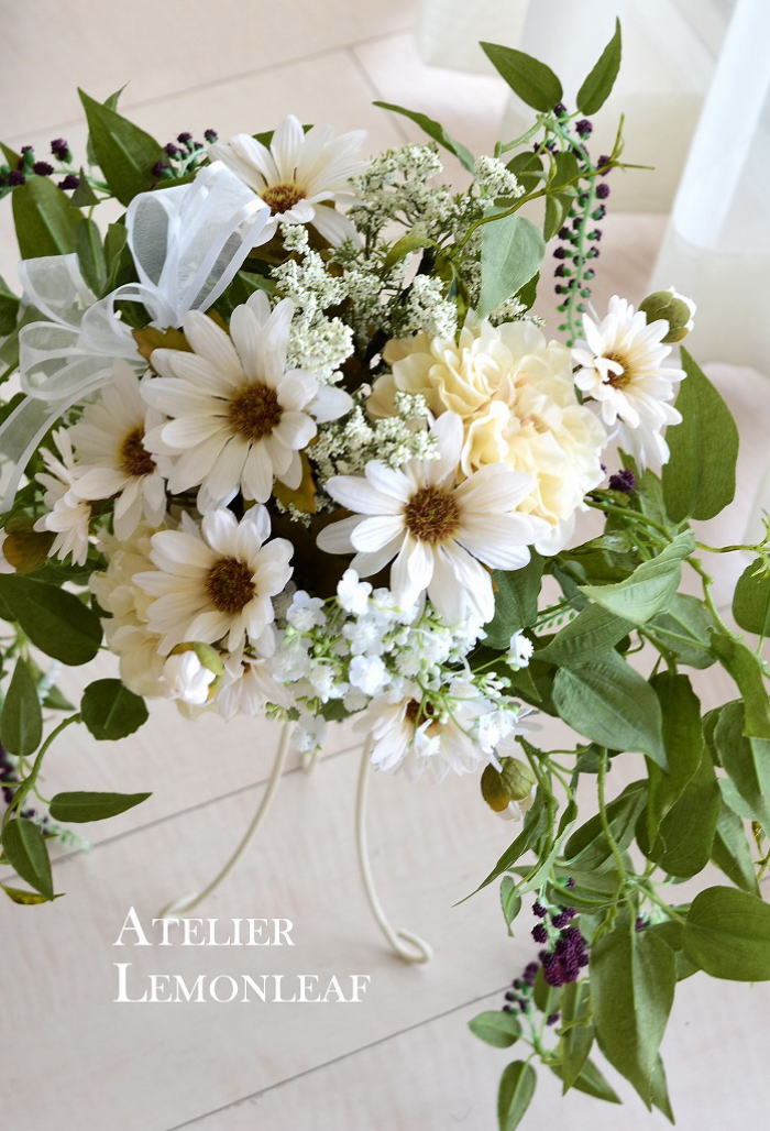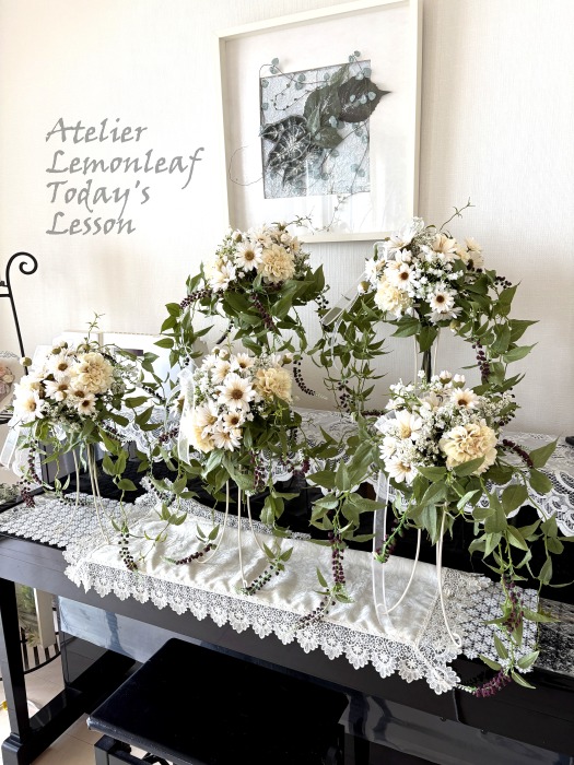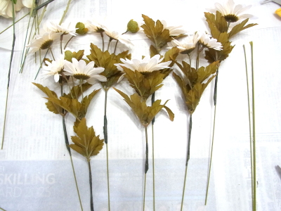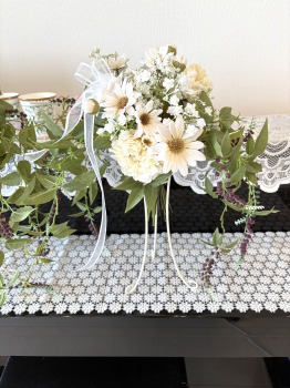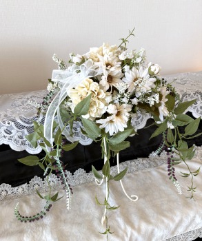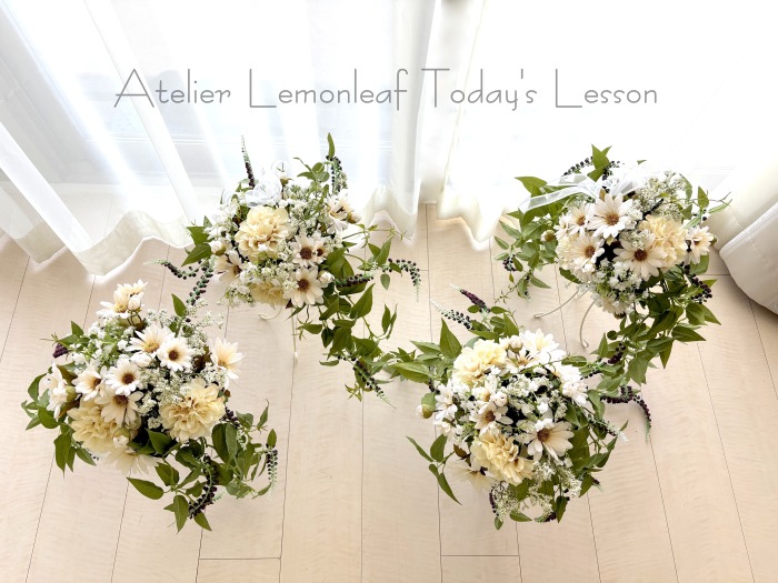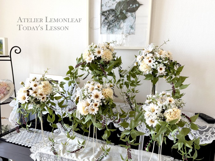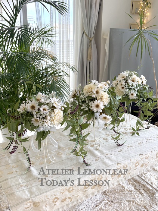 | 素敵なグリーンに出会いました。両サイドに添えるだけで、シャワーブーケのシルエットになります。 高さのあるスタンドが一層グリーンのツルの魅力を引き立ててくれます。実は足元に置いて上から見るのも素敵なんです♪ ではさっそく作っていきましょう ! デイジーはすべて小分けにします。 ダリアとデイジーに18番ワイヤー1/2を添え木してステムをつけます。 ポイント テープで巻くのは、重なっている部分だけでOKです。 レジを全部外して一本一本に 添え木します |