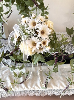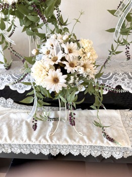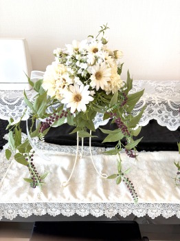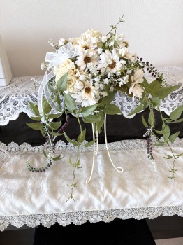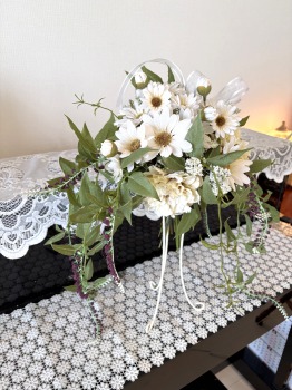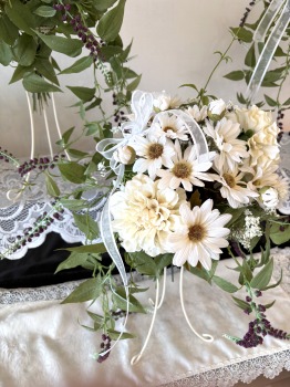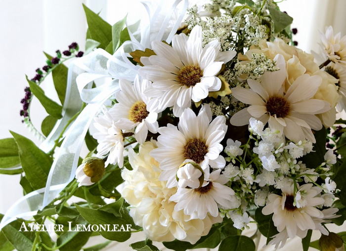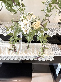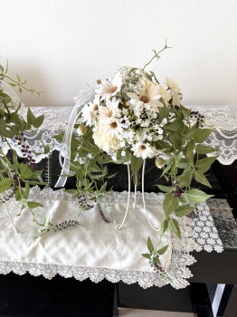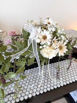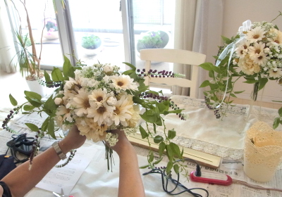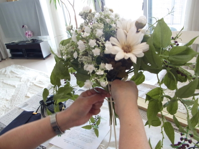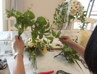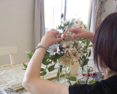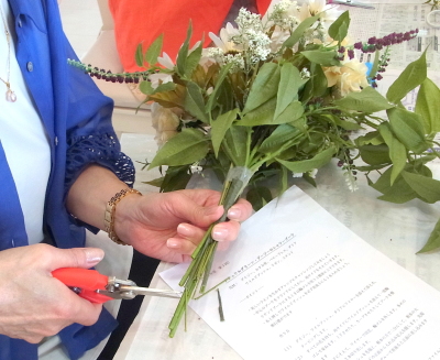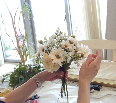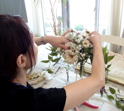 | ここからさらに、お花を整えます。 お花のヘッドを持つと抜けてしまうので茎を持ってゆっくり上下させます あるいは場所を移動したり グイット曲げたり。 フンワリとした表情をつくりましょう。 |