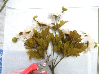 | アレンジの奥の方で重なっている葉っぱをカットして、 テープやワイヤーを隠します |
