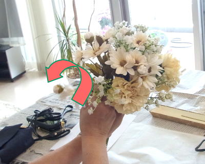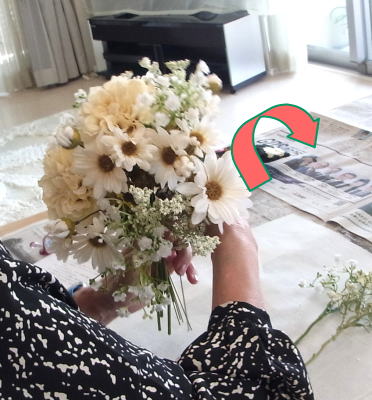セロテープで固定してあるので、安心して、ゆっくり上下できてます ポイント 直立している花束を、ここから手前や後ろのほうは、どんどんグイっとまげて曲げて広げて空気感をいれます ふわっとさせましょう! |