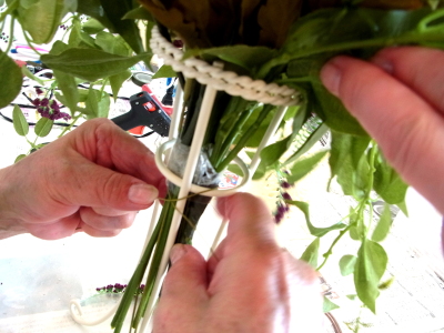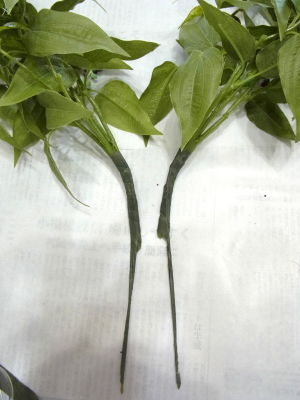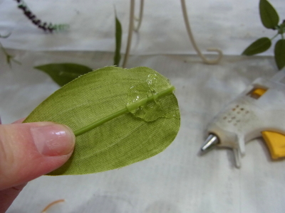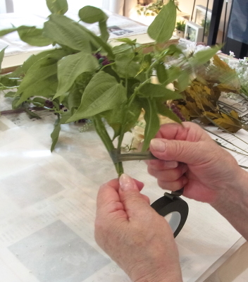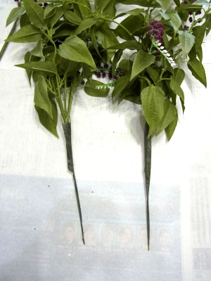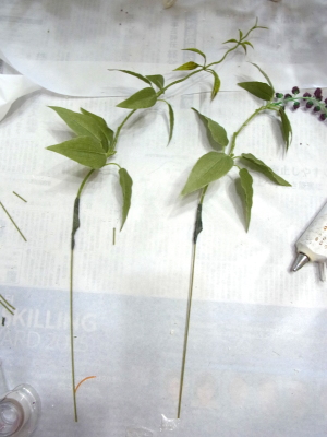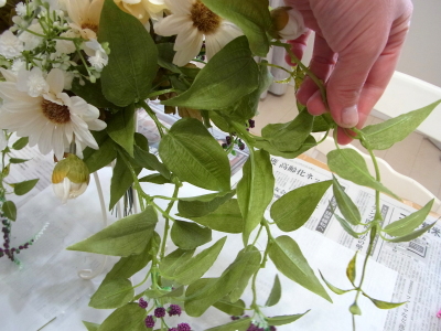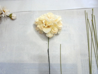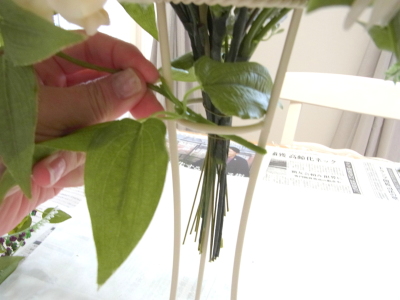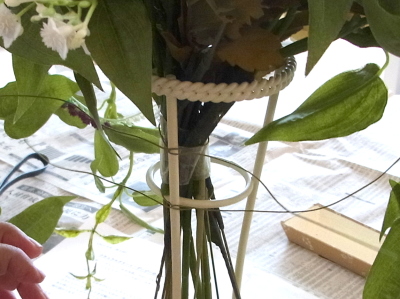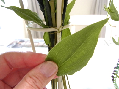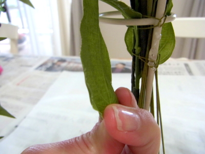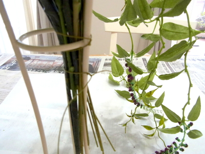 | 長いほうはステム添え木して、これは前後にいれます。茎の長さを調節して 花束に挿して、グルーで固定します。 ポイント こうすることで、ツルのラインが、左右だけでなく前後にはいり、さらに立体感が生まれます。 |