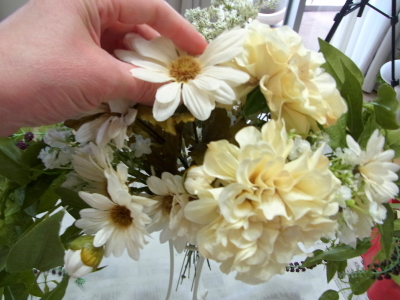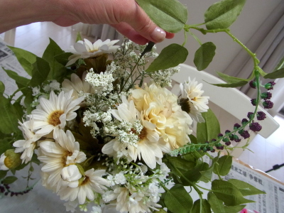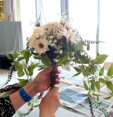 | デイジーまたはダリアなど、好きなメインのお花を決めて、大体のレイアウトをきめててドーム状にまとめます 。 この時点ではまだ直立で大丈夫です。 |