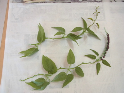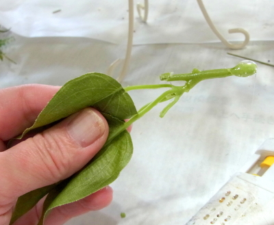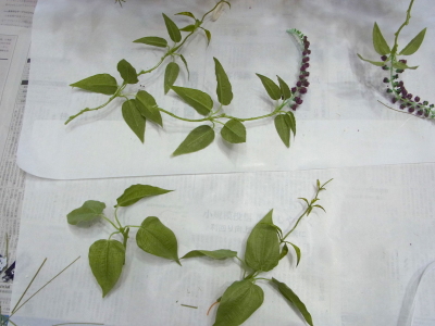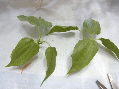 | カットして、下の、四枚くらい葉っぱが付いている部分と、長いツルに分けます。 | |