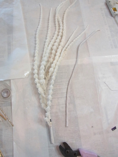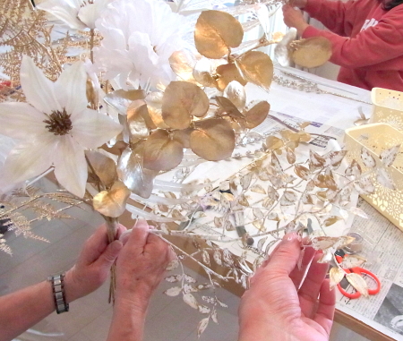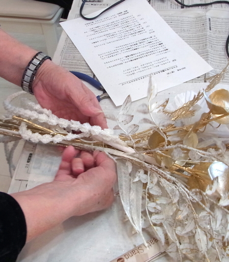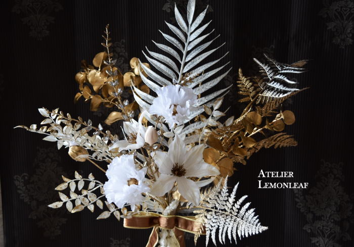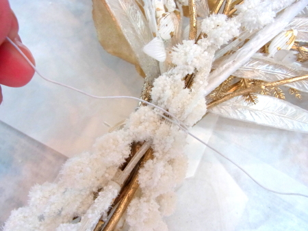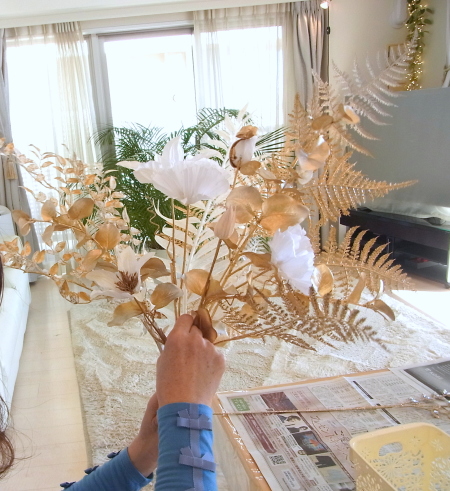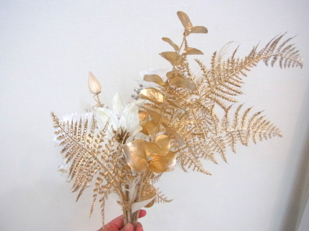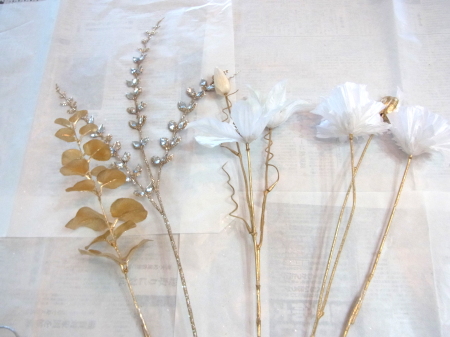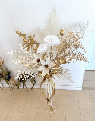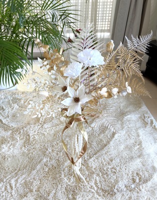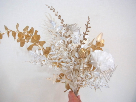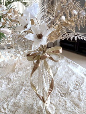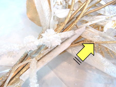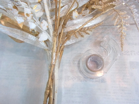 | 上記のお花をいれたら、 ポイント 足りないところ、「欠け」があるところにけファーンスプレーを入れます。白くて尖った細かい葉っぱのアイテムです。 アクセントにキラキラアイテムを。目立つ場所に入れましょう。 場所がきまったらセロテープでとめます |