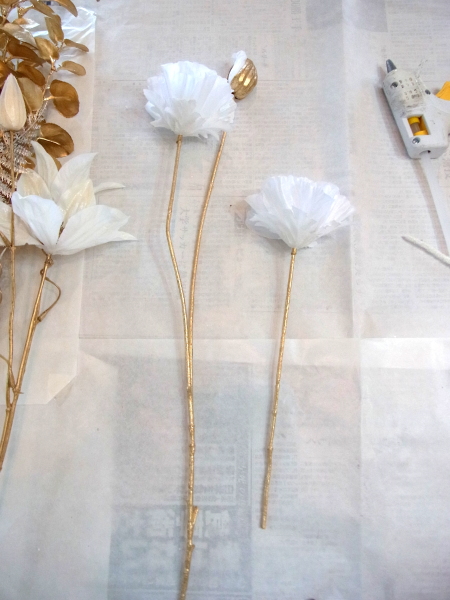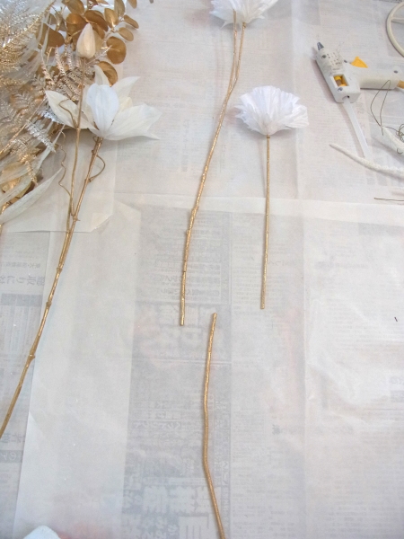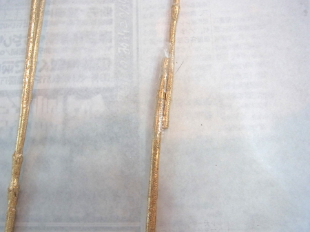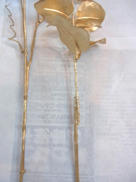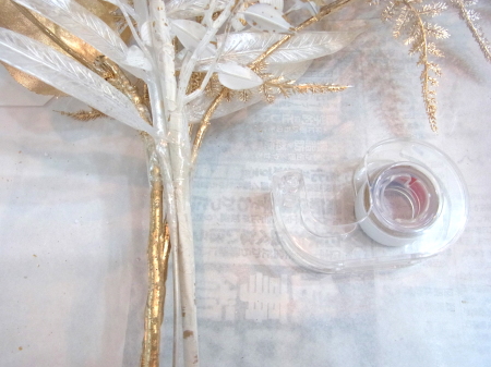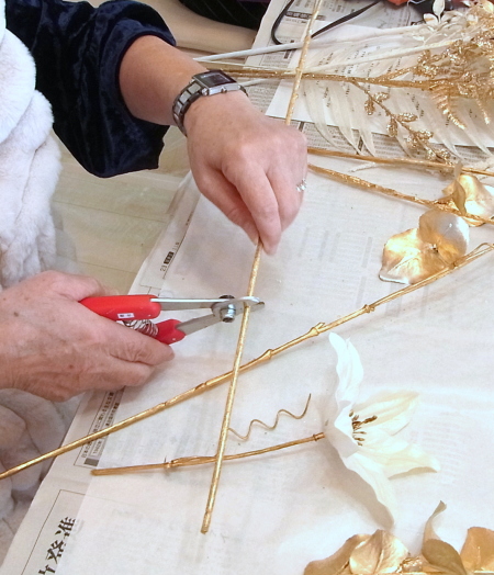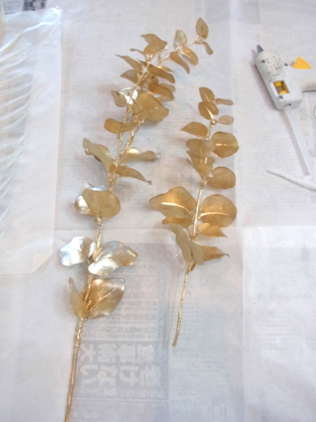 | ユーカリも同様です。 茎から低い方をカットして、同じ種類の茎を1/3ほど切ってセロテープまたは 白いフラワー^テープでとめて添え木にします。 |