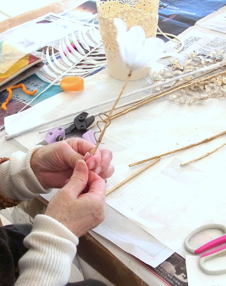 | 場所が決まったらセロテープでまとめます。(最後にしっかりワイヤーをかけるので、安心していてくださいね!) | |