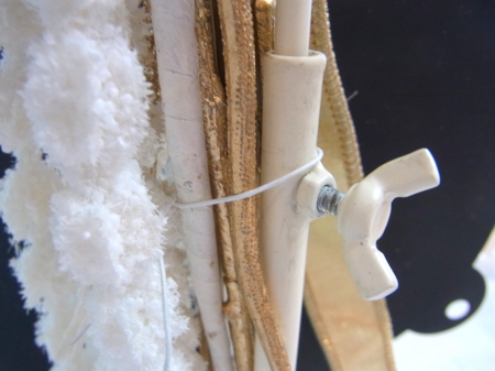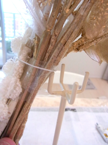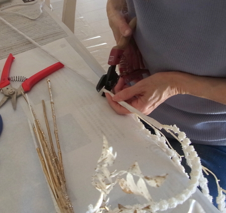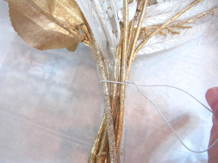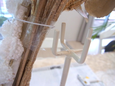 | 全体を整えたらワイヤーでしっかり固定します。 ポイント ワイヤーは何周も巻かなくてOK,2週くらいにしておいて、キワをしっかり ねじりましょう 。 間にセロテープがあるので、クッションとなり、ワイヤーが食い込んで、しっかり固定できます。 |