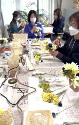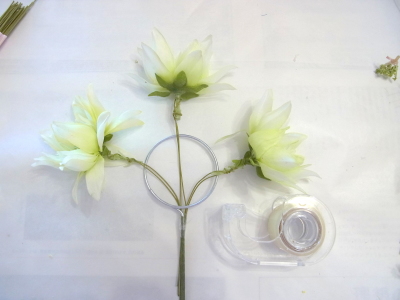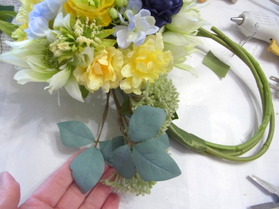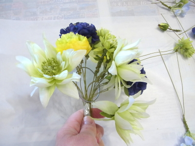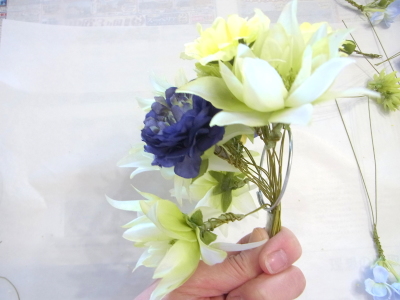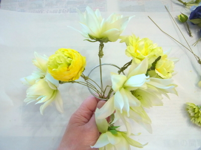 | 好きな場所にお花をいれていきます。 2~3本づつ輪にさしては、セロテープで固定、固定してから、出したりひいたり自在です。 お花のワイヤーをカーブさせながら、ドーム型をつくります。小さくつくるより、フンワリ、多少の隙間があるくらいで大丈夫です。 つぼみなどは少し高めに、他のお花も凹凸をつけながら、いれていきます。 |