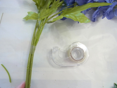 | デルフィニウム3本を好きなレイアウトにして茎の上の方で2か所程度セロテープでまとめます。 セロテープは広範囲になると、あとで隠せないので、手もとのあたりに集中させると綺麗にできます。 下の方の大きな葉は1~2枚カット |
