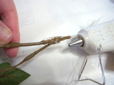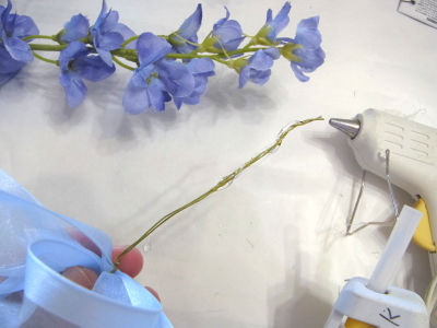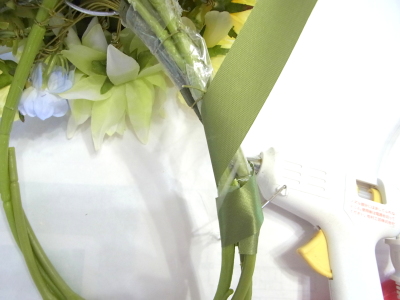 | 緑のリボンを下から巻き上げて、ワイヤーとセロテープを隠します。 リボンの始まりと終わりはグルーで固定します。 |