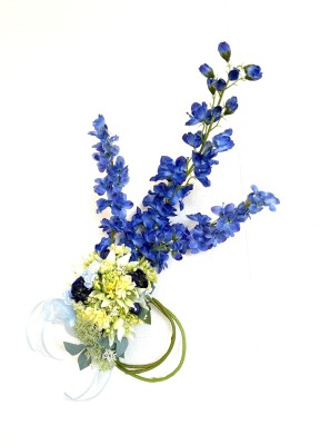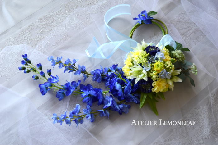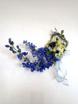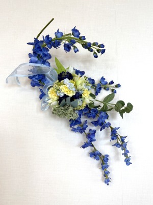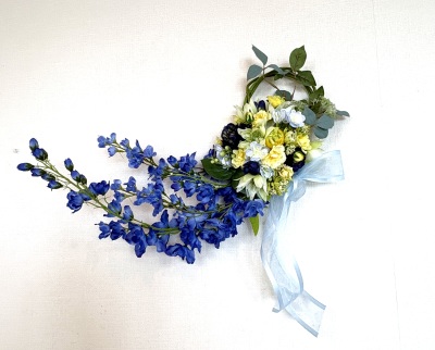 | デルフィニウムの枝を好きな場所にレイアウト、横や手前にまげて好きなシルエットを描きましょう。 そのさいグラグラする枝は、背面でリングに固定します。 |